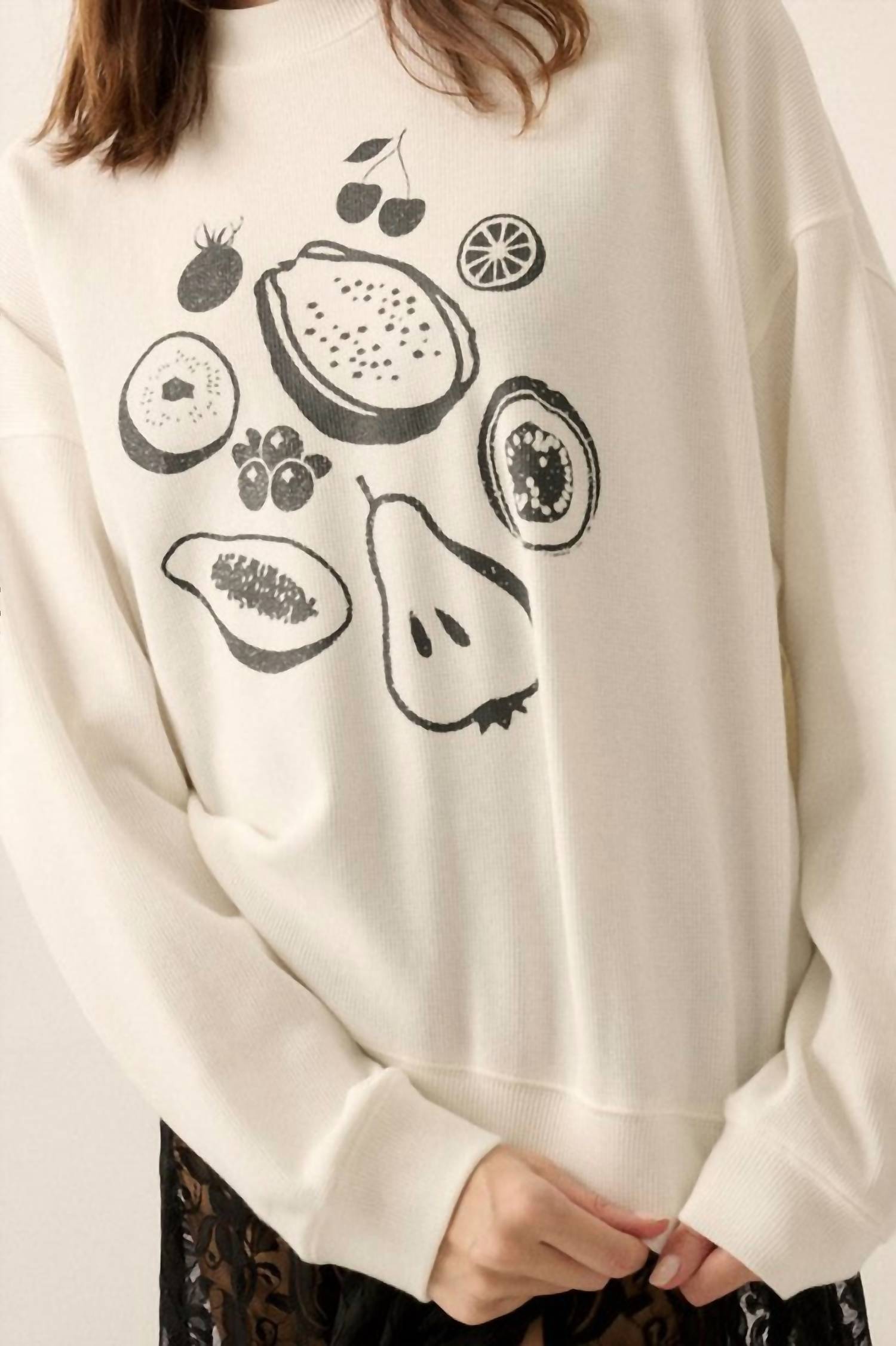 Cozy fabric, impeccable design - Meet the sweatshirt that you'll never want to take off. Chic white waffle-knit thermal sweatshirt. Showcases long sleeves and a relaxed drop shoulder fit, adorned with a vintage-style fruits graphic print for a playful twist. Composed of 95% Cotton and 5% Spandex. Ensures comfort with its ribbed collar, cuffs, and hem. Convenient pull-on style enhances ease of wear.