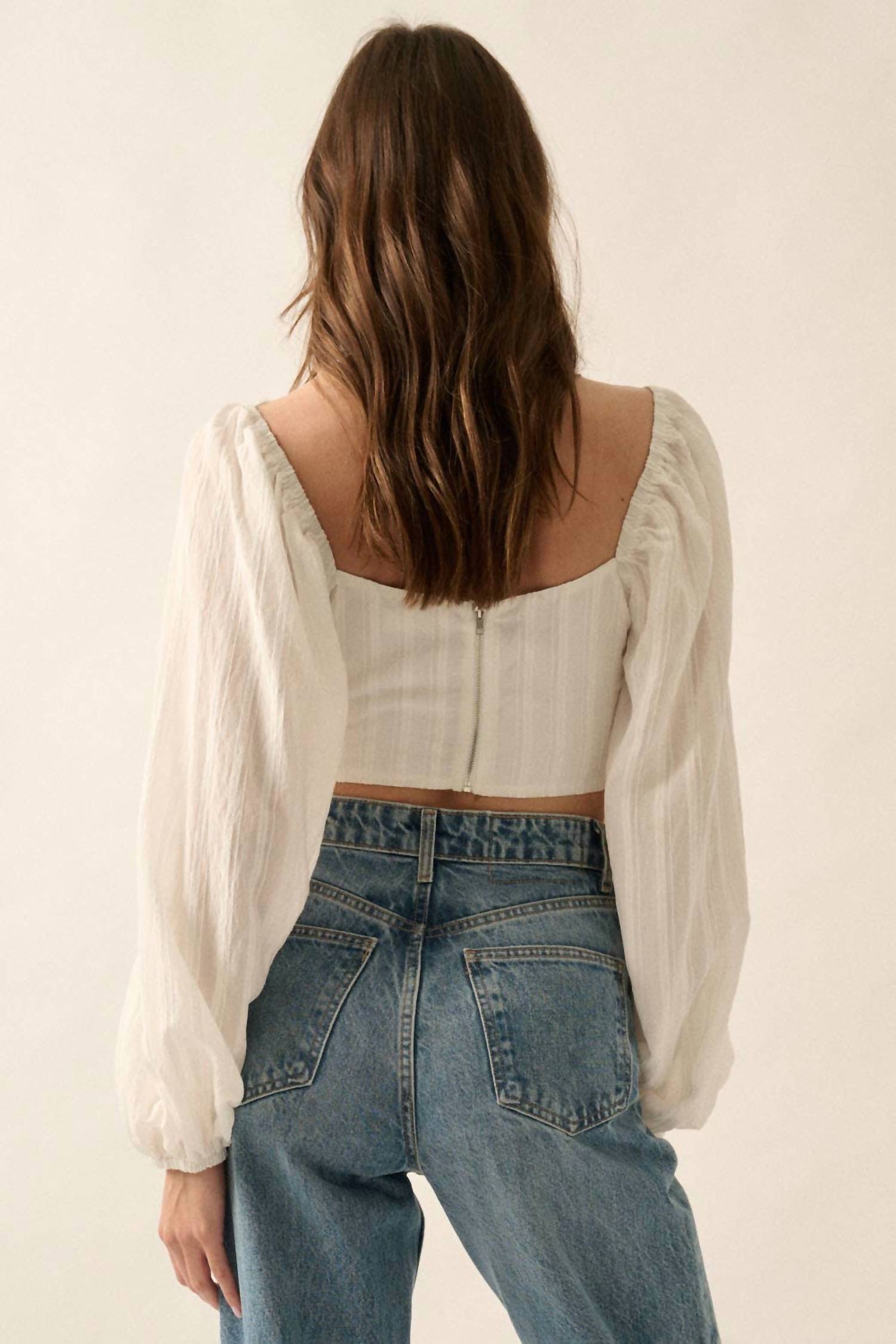 Pair this crop top with your favorite high-waisted jeans or maxi skirt. This elegant piece is crafted from 85% Rayon, 15% Nylon and features long sleeves with elastic cuffs for added refinement. Its U neckline with ruffle trim and corset-style bodice offer a flattering fit, while the low scoop back with a zip closure adds a modern edge. Designed in LA and imported, this fitted silhouette is perfect for any occasion. Model is 5'9" and wearing a size S.