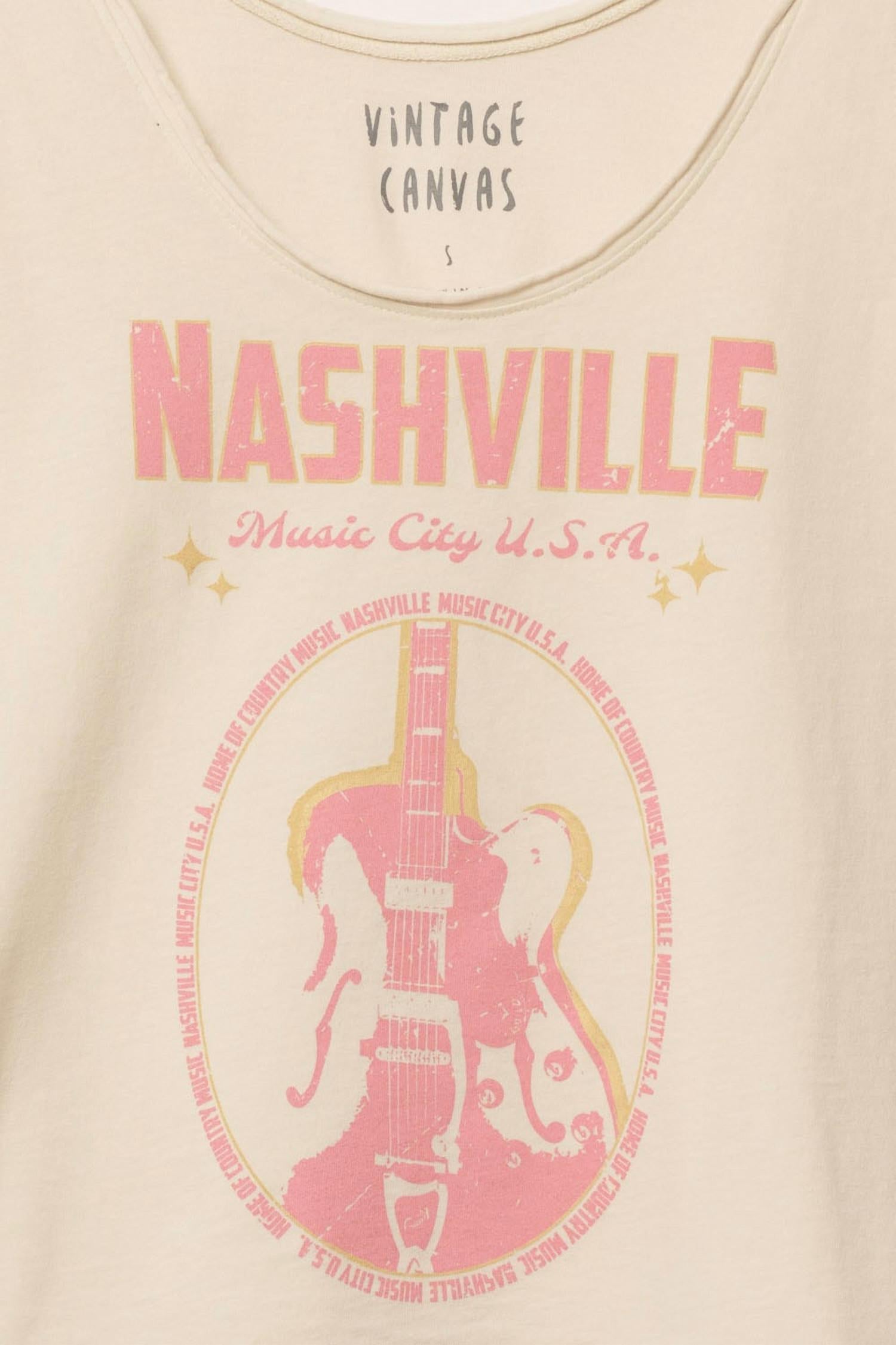 Embrace casual charm with the PROMESA Nashville Music City Racerback Graphic Tank Top in White Smoke. This sleeveless tank offers a relaxed fit and features a vintage-style guitar graphic print with "Home of Country Music, Nashville Music City U.S.A." text, perfect for music lovers. Designed with raw edge neck and arm holes, it showcases a low scoop back and racerback style for a laid-back vibe. Ideal for warm days, this tank is a fun addition to your summer wardrobe.