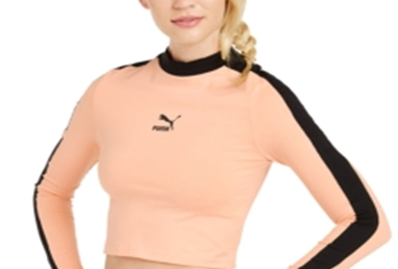 Puma Women's Tee Shirts Parfait Side Stripe Logo Cropped Long Sleeve Top Orange Size X-Large