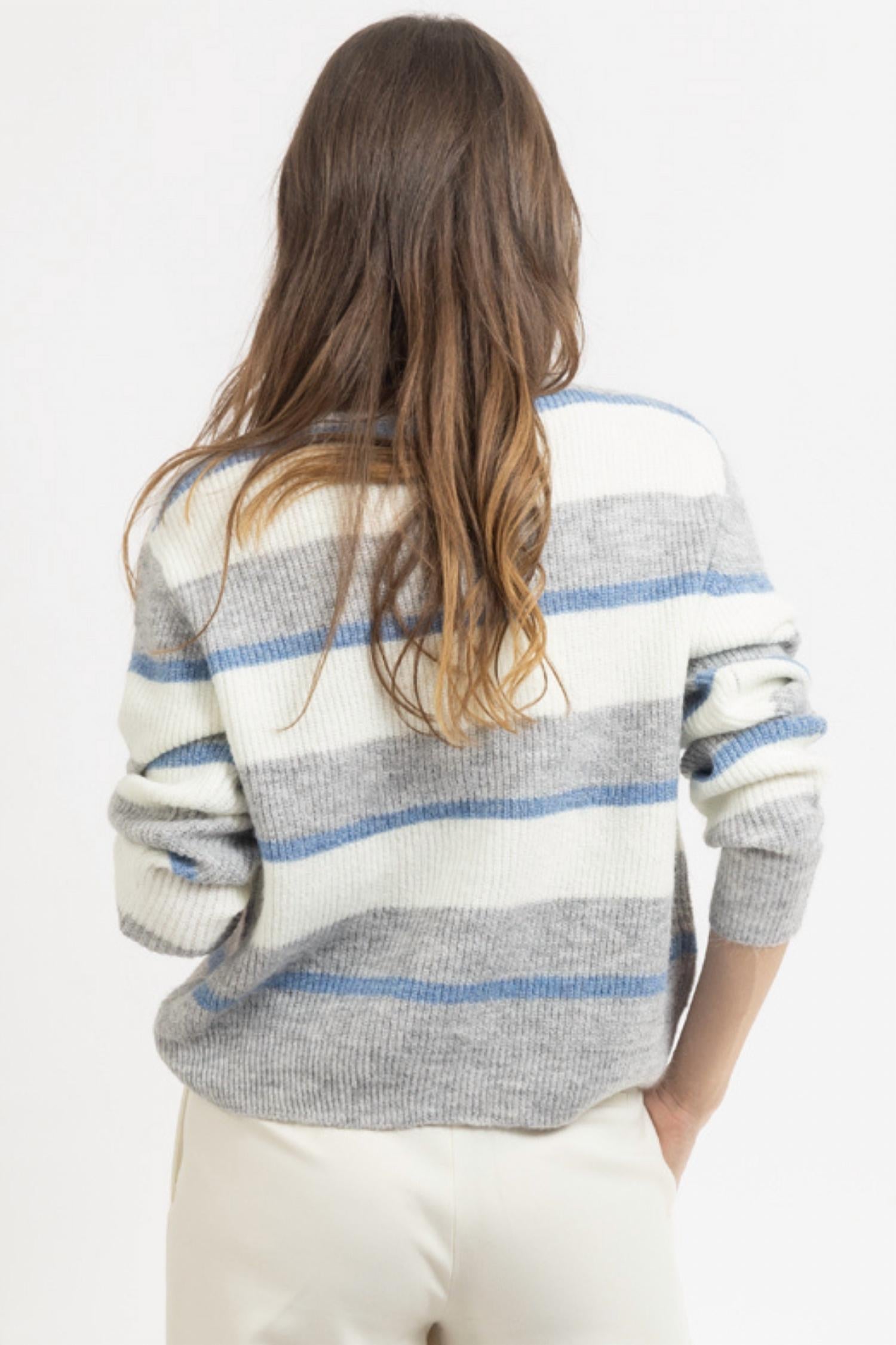 The ultimate go-to sweater, expertly crafted to provide the perfect combination of warmth and style. Its classic design and soft fabric make it a must-have addition to your wardrobe. Introducing the Striped Sweater by Q2 in a frosty hue, perfect for adding style to any wardrobe. This women's sweater features long sleeves and a classic crewneck, designed in a relaxed fit with a striking striped pattern throughout. Crafted from 100% Cotton, the knit fabric offers both comfort and breathability. Closure: Pull on. Naomie is wearing a size small (5'8" height, dress size 2).
