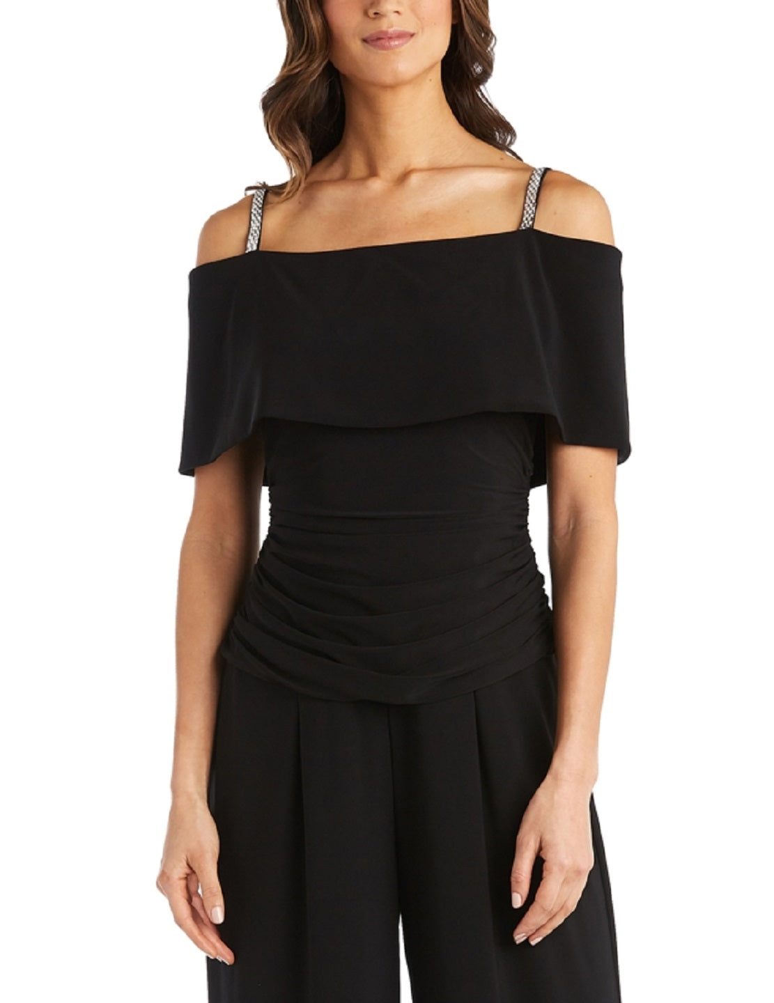 Cold-shoulder cutouts are accented by gorgeous rhinestone-embellished straps on this petite jumpsuit from R & M Richards
