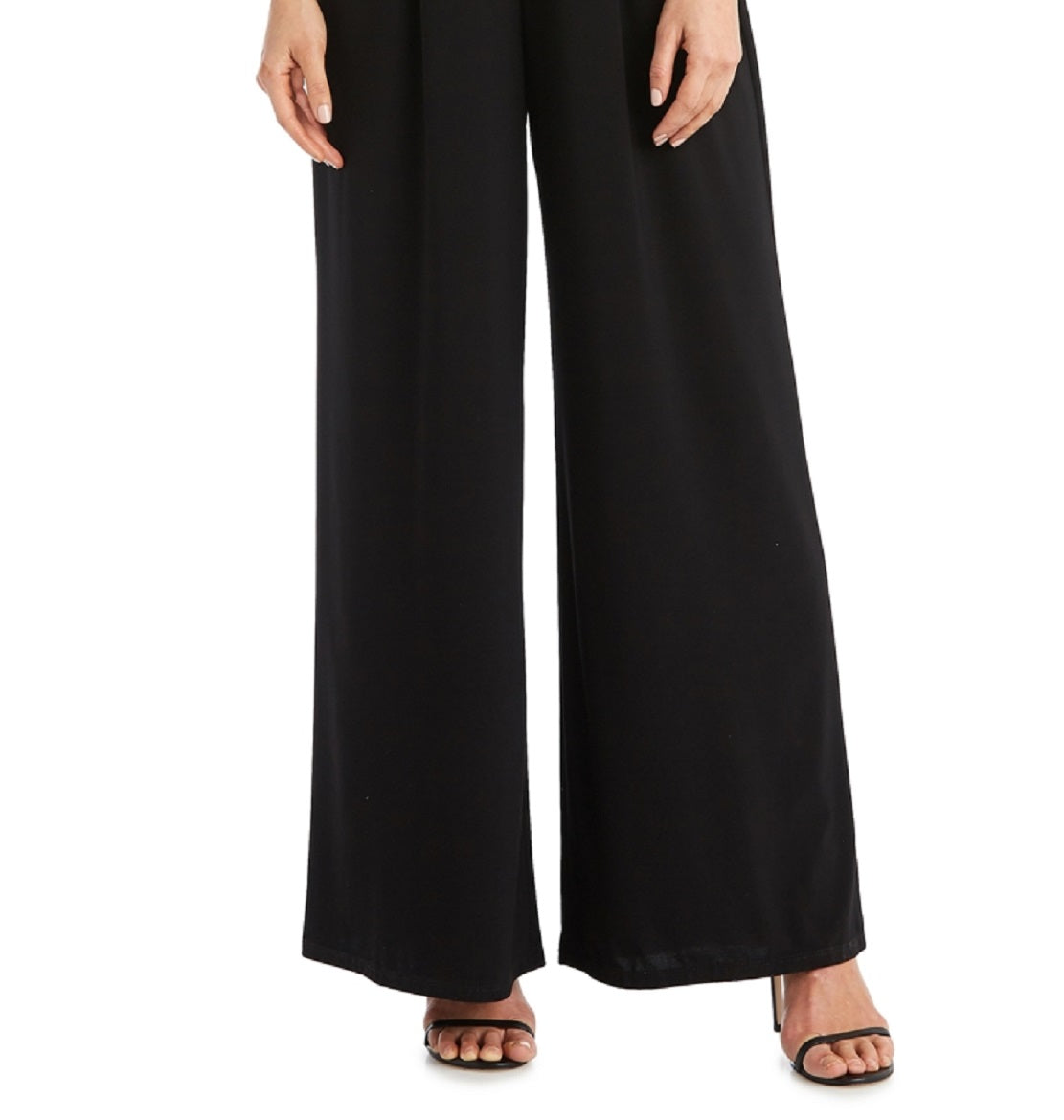 Cold-shoulder cutouts are accented by gorgeous rhinestone-embellished straps on this petite jumpsuit from R & M Richards