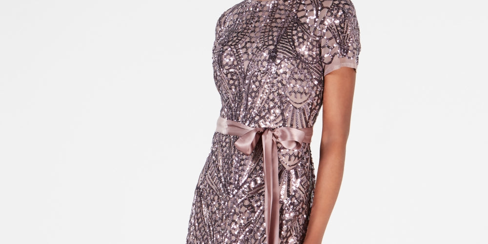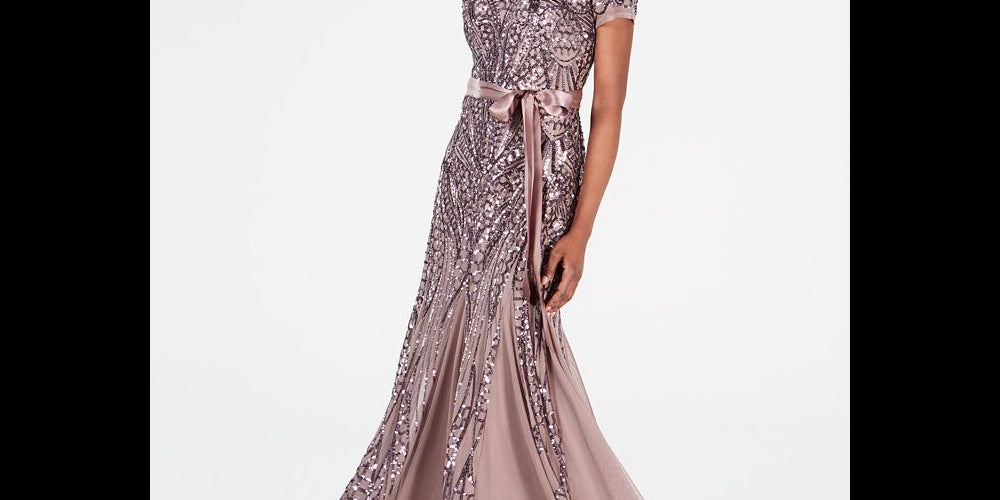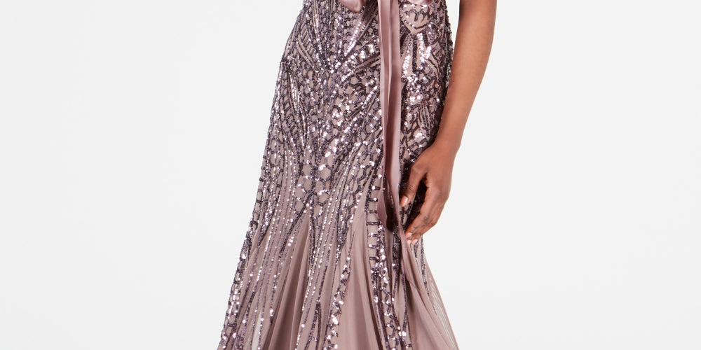 An elegant satin ribbon accentuates the waistline of this glamorous gown from R & M Richards| dazzling with sequins and godet pleats