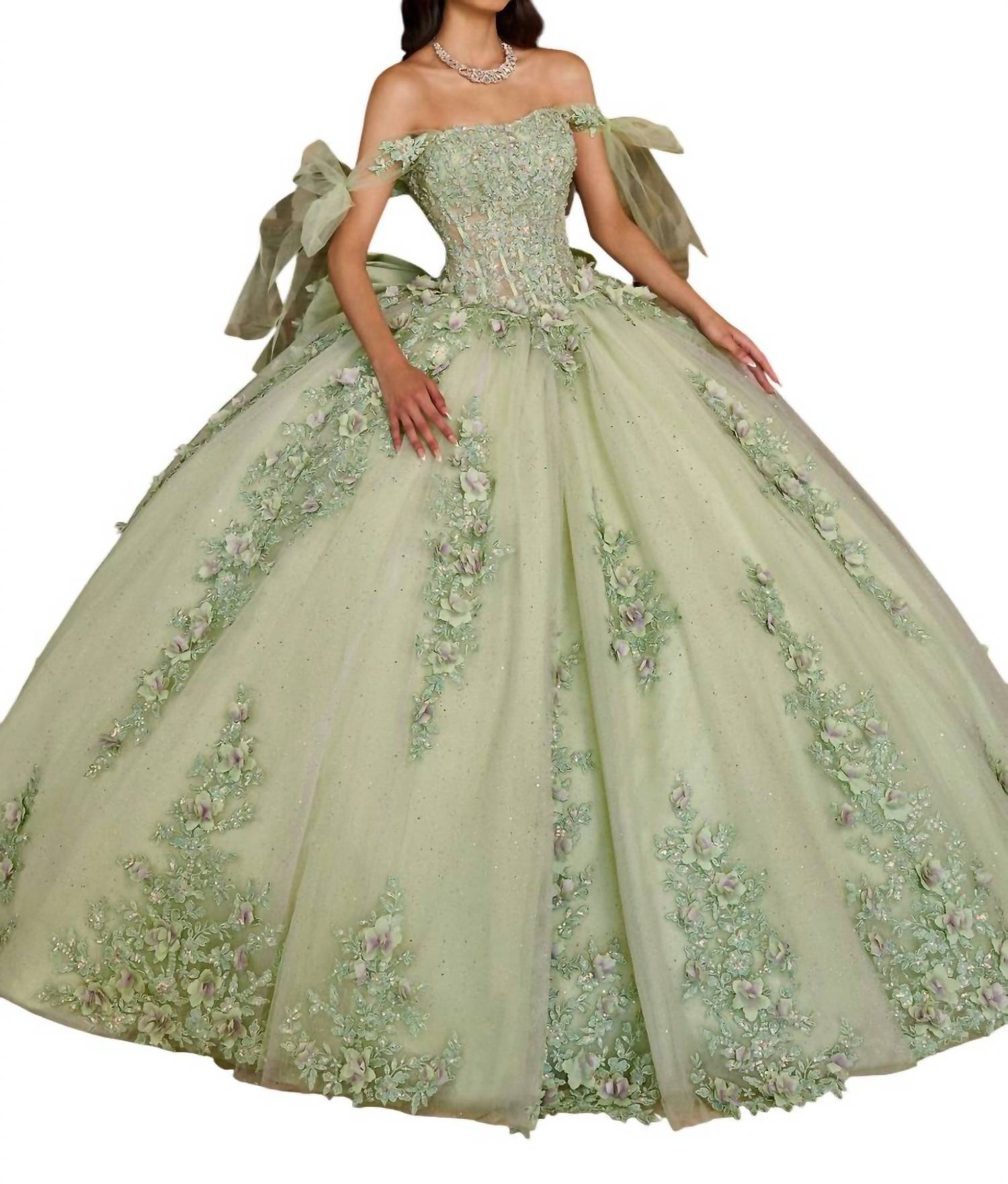 A maxi dress that is just as cute as it is comfortable. Embroidered lace appliqué A-line gown featuring a sheer corset bodice with beading, off-the-shoulder neckline, and lace-up back with an elegant bow. Finished with a glitter tulle skirt for a sparkling, statement look.
