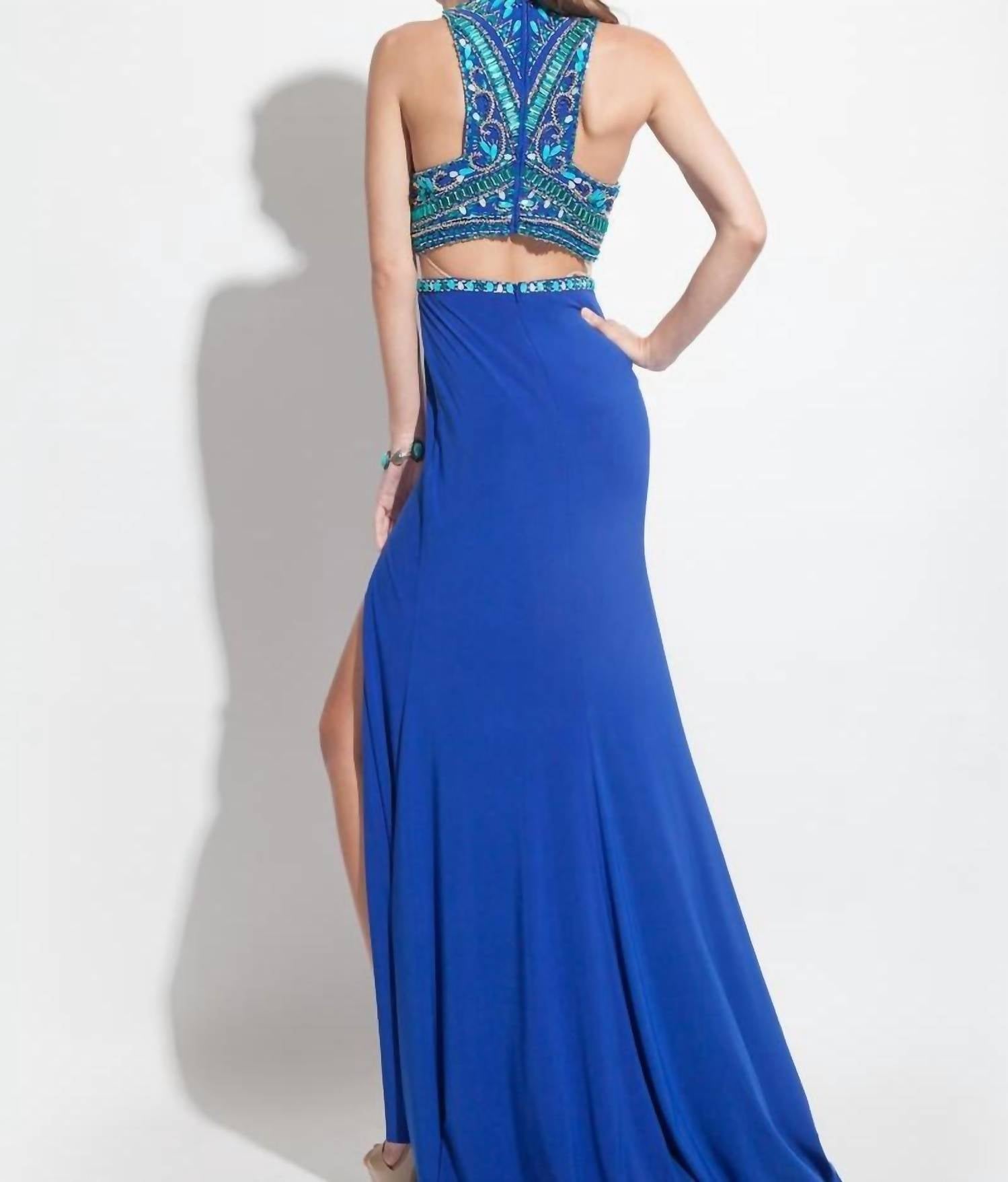 Looking for that perfect event dress? Look no further... Introducing the Beaded Jersey Prom Gown With Cutouts by Rachel Allan, a captivating choice for your next prom in a striking royal hue. This sleeveless gown features a high halter neckline with a beaded bodice, adding a touch of glamour and sophistication. The design includes side and back cutouts along with a high slit, offering a flattering and daring silhouette. Closure: Zip Closure.