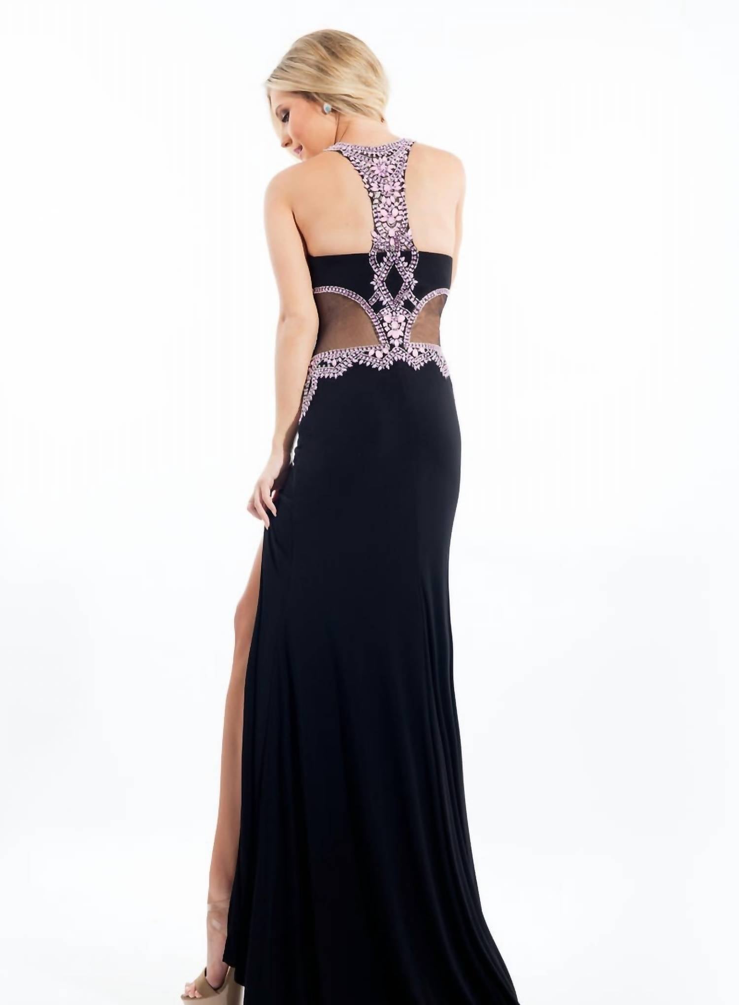 Turn heads in the cutest and most flattering evening dress. Step into elegance with the Beaded Jersey Prom Gown by RACHEL ALLAN, perfect for a show-stopping entrance. This sleeveless, halter-neck gown is crafted from luxurious black jersey fabric, featuring a striking beaded bodice and daring high slit. The sheath silhouette hugs your figure beautifully, while mesh cutouts add a touch of sophistication. Closure: Zip closure.