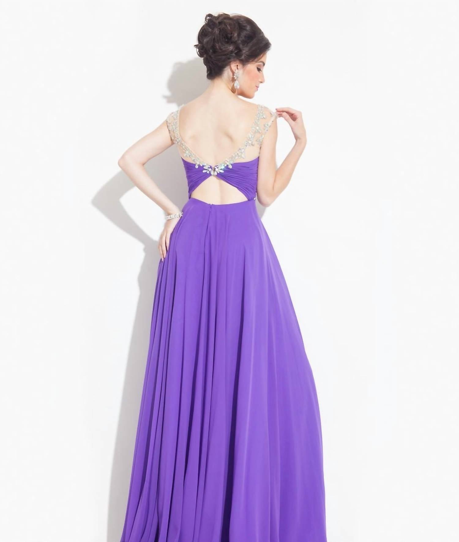 Just add a cute little clutch and a matching heel for the perfect event look. Experience timeless elegance with the Beaded Sheer Neck Chiffon Prom Gown from Rachel Allan, skillfully designed to enhance your silhouette. This gown features cap sleeves and a meticulously fitted illusion bodice that gracefully transitions to a full-length chiffon skirt. The dress is adorned with intricate AB detailing and a stunning ruched bodice, complete with a belt of AB stone accents for added sophistication. Closure: Zip closure. Perfect for prom, this gown epitomizes refined glamour in a striking purple hue.