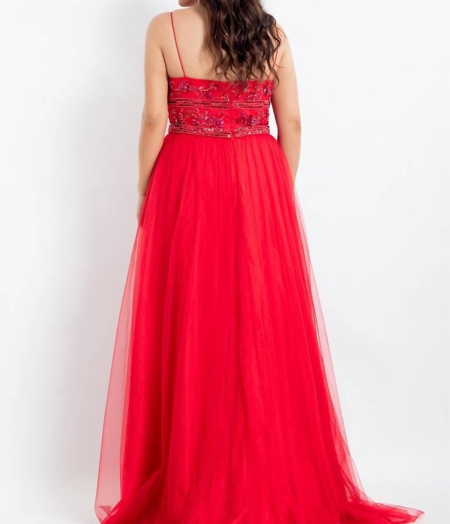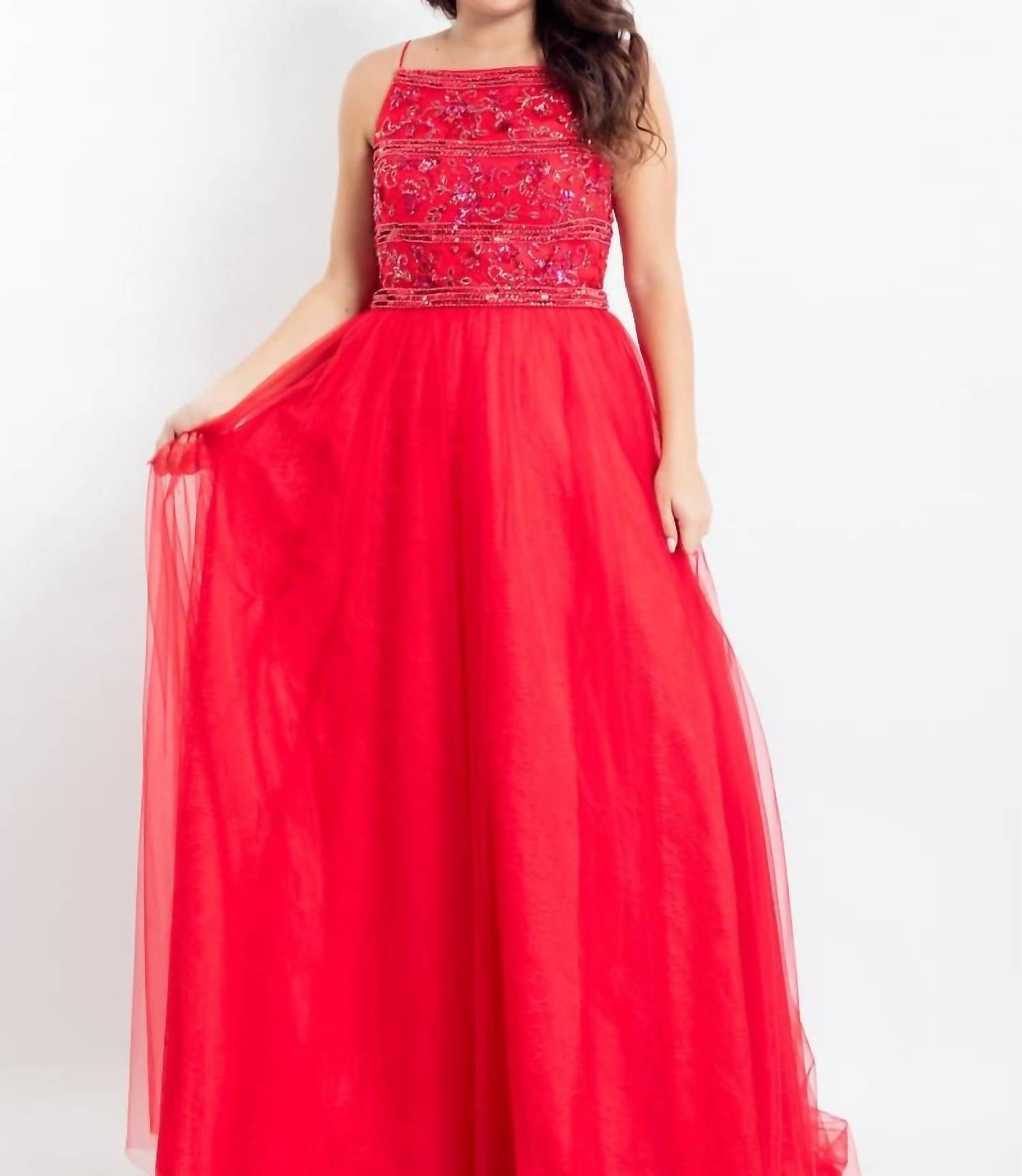 Turn heads in the cutest and most flattering evening dress. Introducing the Beaded Tulle Prom Dress by RACHEL ALLAN, a stunning red gown designed to make a statement at any special occasion. Featuring delicate spaghetti straps and a square neckline, this dress showcases a beautifully beaded bodice and waist that lead into a tulle full-length skirt. Material: Lace/Tulle. Closure: Zip closure. Ideal for plus-size women looking to shine at prom.