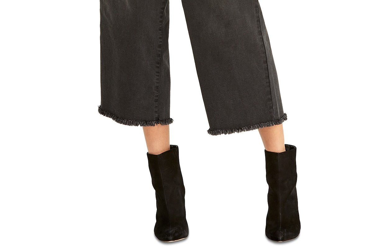 Approx. inseam: 26"|High rise|Zip fly; belted waistband|Raw hem