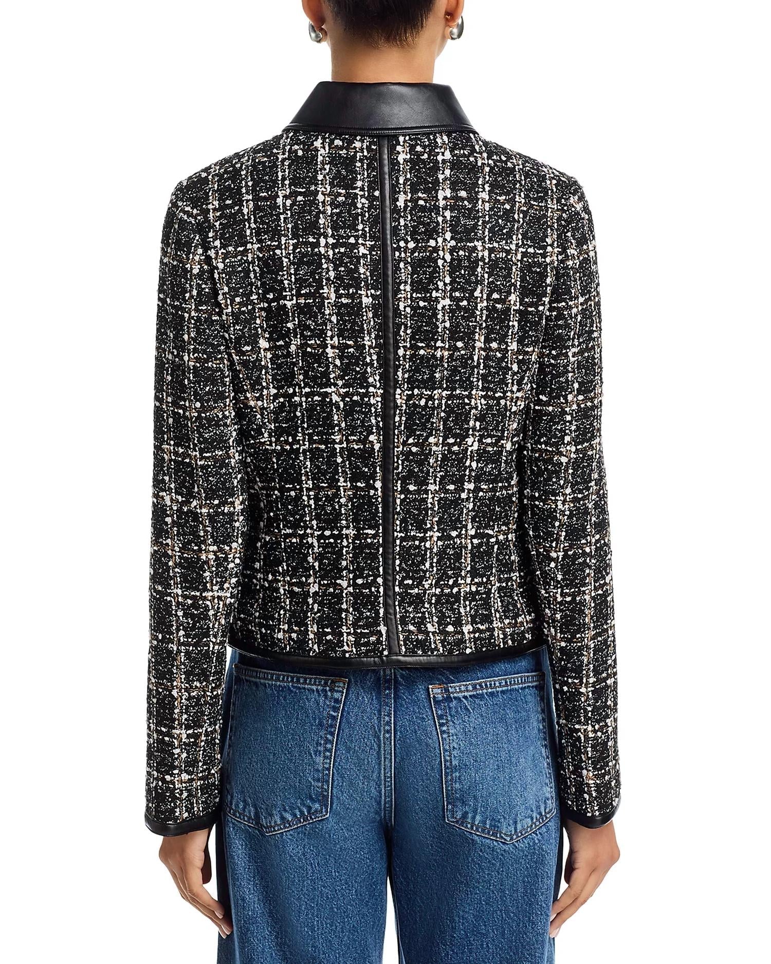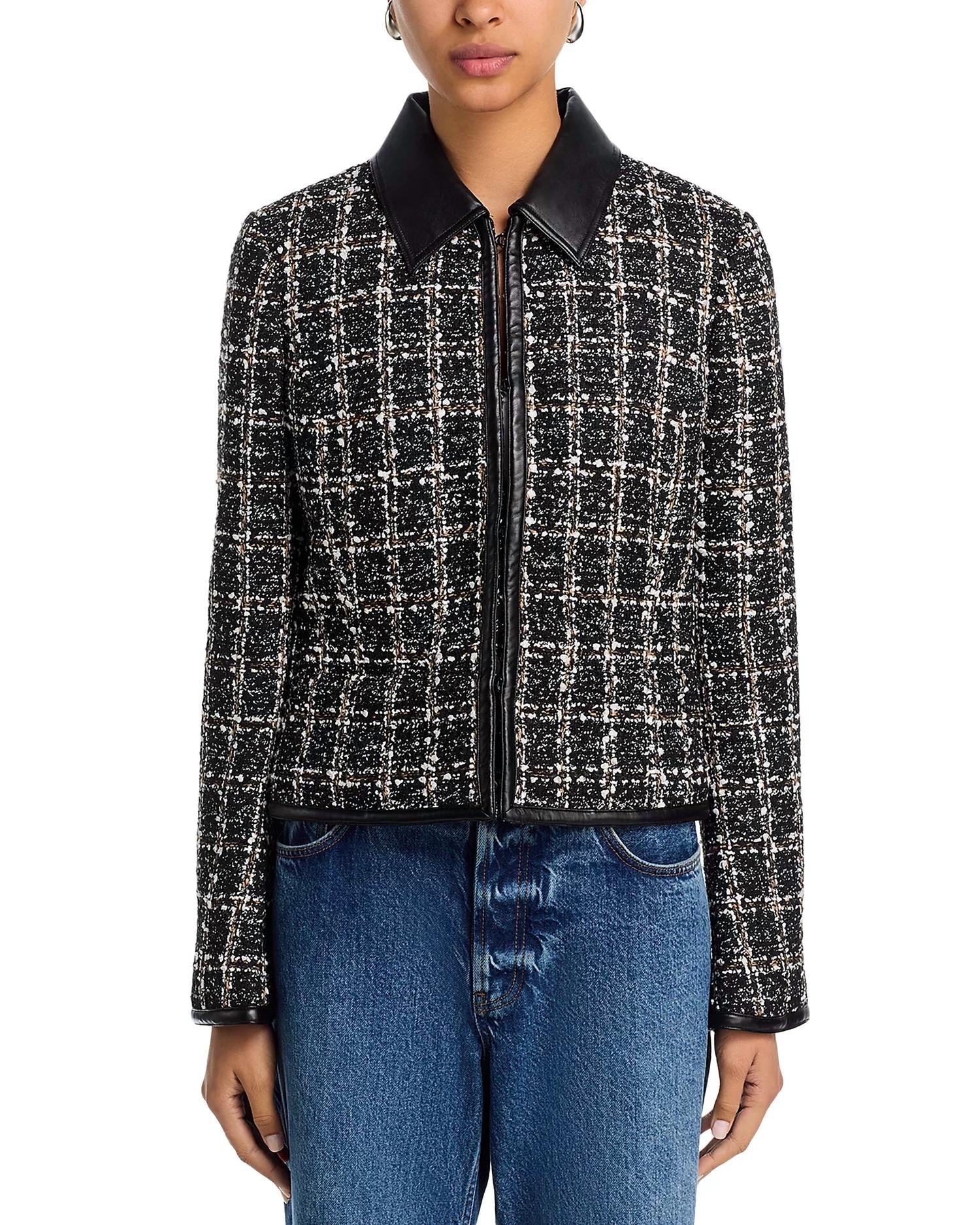 A modern twist on the classic blazer, the Eloise is tailored in textured tweed with sharp faux-leather accents. Its boxy silhouette and plaid pattern strike the perfect balance between polish and edge, making it a versatile jacket for both work and night-out styling.