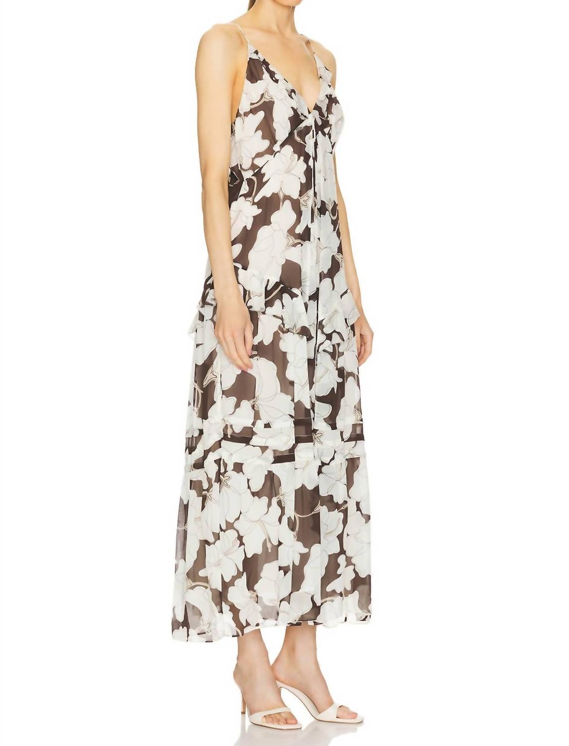 A midi dress so versatile, your options for wearing it are endless. The Boa Dress by Rails is a stunning midi slip dress crafted from 100% Viscose in an enchanting Mocha Floral pattern. Designed with spaghetti straps and a flattering V-neckline, it features a unique satin crepe composition adorned with chiffon frills along the hemline. The adjustable tie closure at the back ensures a personalized fit, perfect for transitioning effortlessly from day to night. Imported and designed for easy care, this dress requires dry cleaning to maintain its elegant appeal. The front body length measures 43 5/8" from size small.