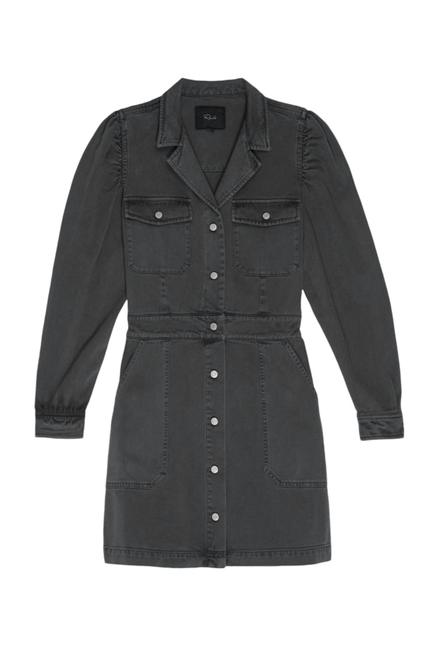 Structured Twill Denim Mini Dress – This long-sleeve, unlined mini dress in charcoal grey features a button-down front, classic fit, and notched collar. Designed with military patch pockets at the chest, front hip pockets, and puff sleeves, it combines casual ease with a polished look. Finished with branded rivet buttons, it’s perfect for a lightweight, transitional denim style. Made from 50% cotton, 50% rayonMachine wash cold separately on a gentle cycle.