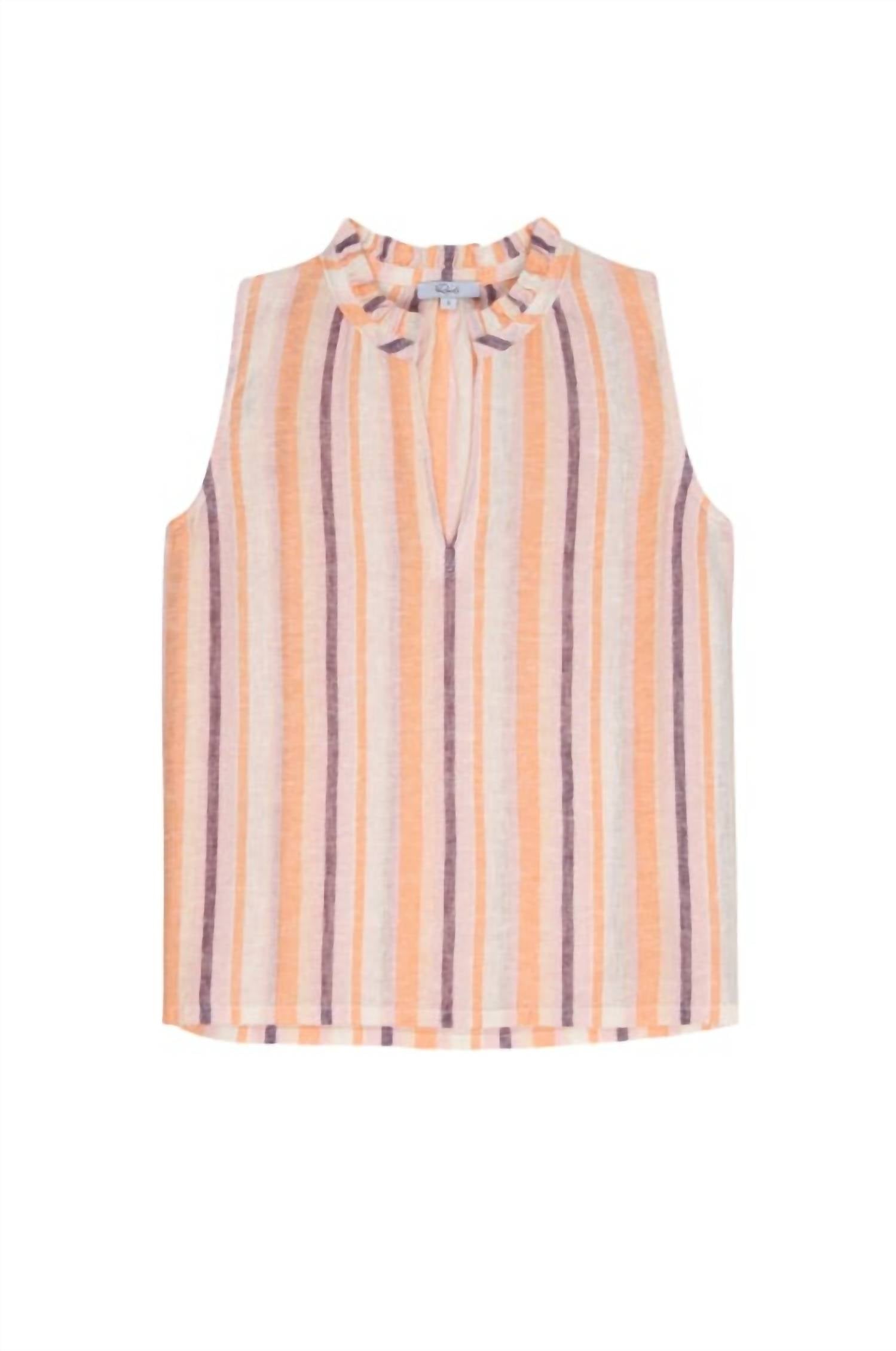 This V Neck Top is crafted from a luxurious linen blend of 55% linen and 45% rayon, featuring a sleeveless design and a convenient pull-on closure. Its relaxed fit and stylish stripes make it suitable for both casual outings and more polished evening looks.