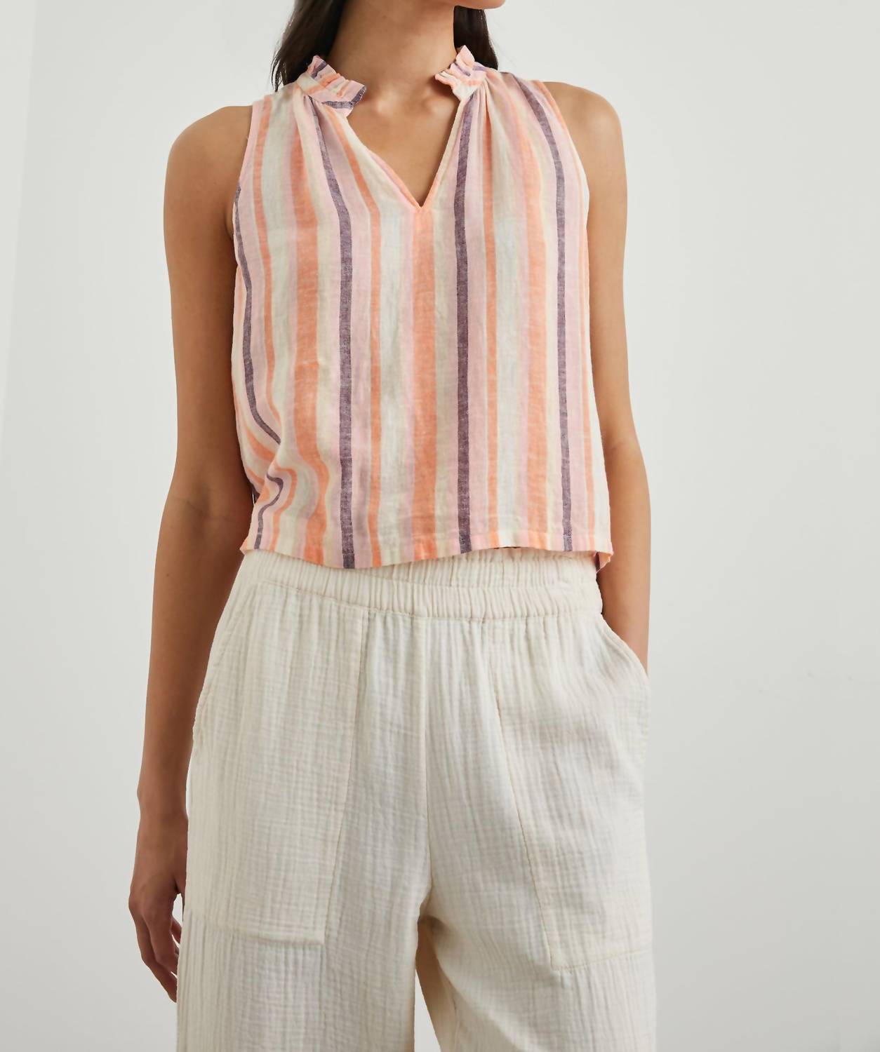 This classic tank top is perfect for layering and cute enough to wear on its own. This V Neck Top is crafted from a luxurious linen blend of 55% linen and 45% rayon, featuring a sleeveless design and a convenient pull-on closure. Its relaxed fit and stylish stripes make it suitable for both casual outings and more polished evening looks.