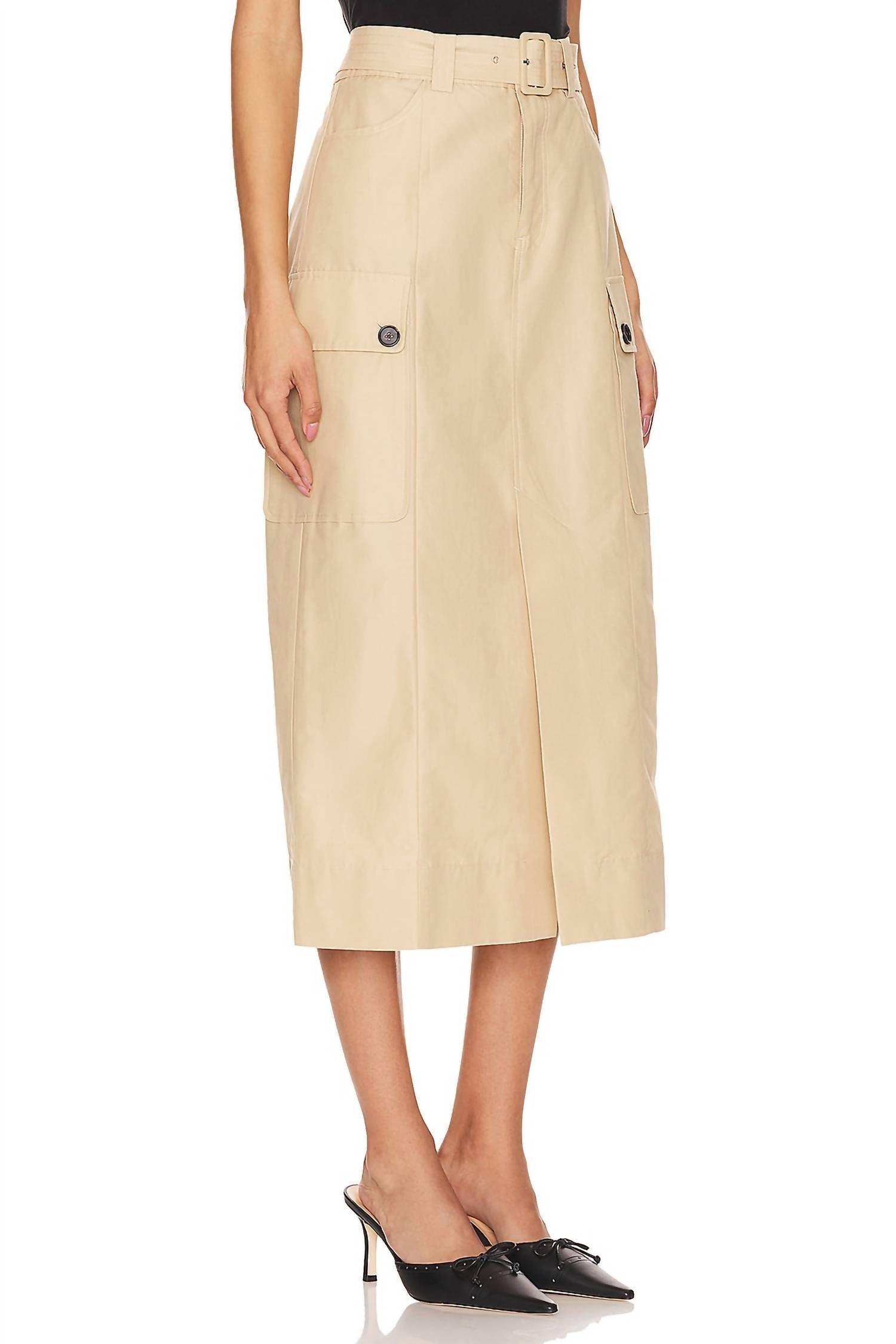 Tuck your favorite tee into this midi length skirt for an effortlessly cool look.Zip fly with button closure. Attached waist belt. Front slip pockets. Cargo pockets. 34 1/2" length (size 8). Self: 73% cotton, 27% linen; Lining: 100% cotton. Made in China. Hand wash. Unlined.
