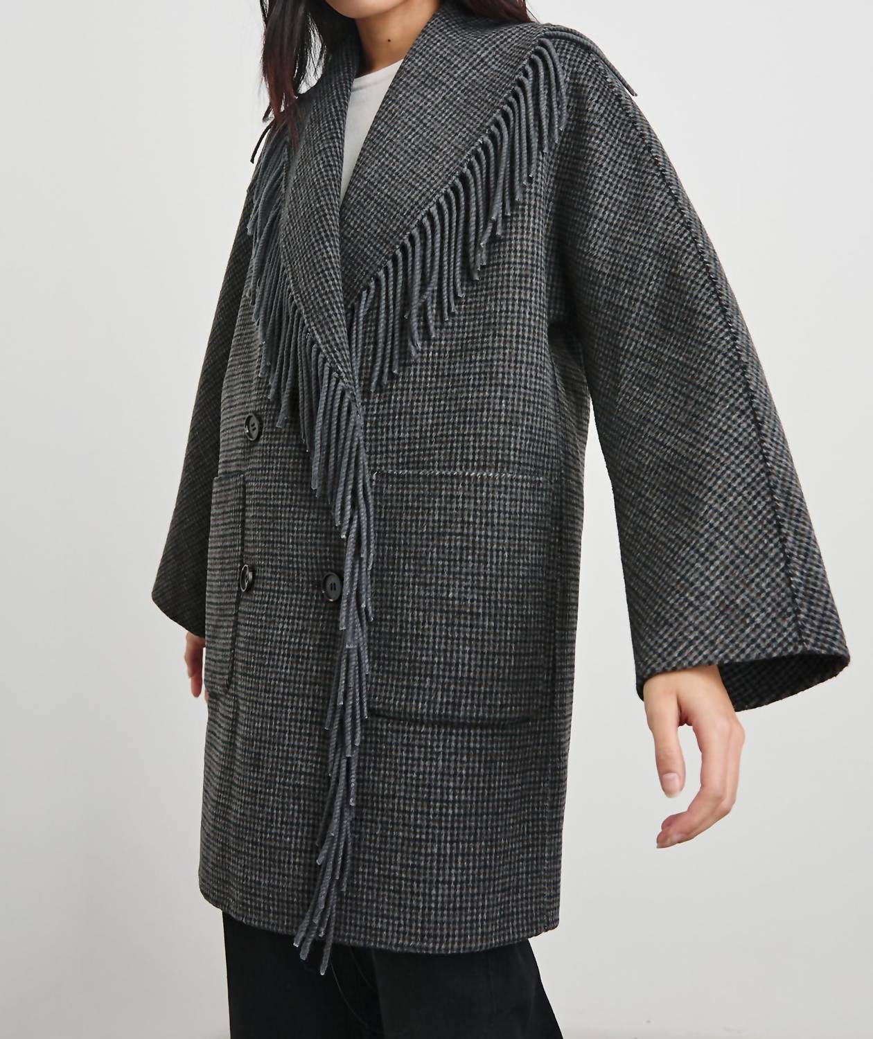 A timeless classic. You'll be reaching for this trench every season. Embrace the chill with the Hugo Coat by Rails, a standout shawl-coat hybrid in eye-catching Charcoal Check. This plaid trench coat features long sleeves, a 35.25" length, and offers both elegance and practicality with its button closure and functional patch pockets. Crafted from a heavy 51% Wool | 49% Polyester, the Hugo is designed to provide warmth with its double-faced construction and stylish wide lapels. Care for it with a dry clean to maintain its luxurious feel, perfect for travel occasions in the fall.