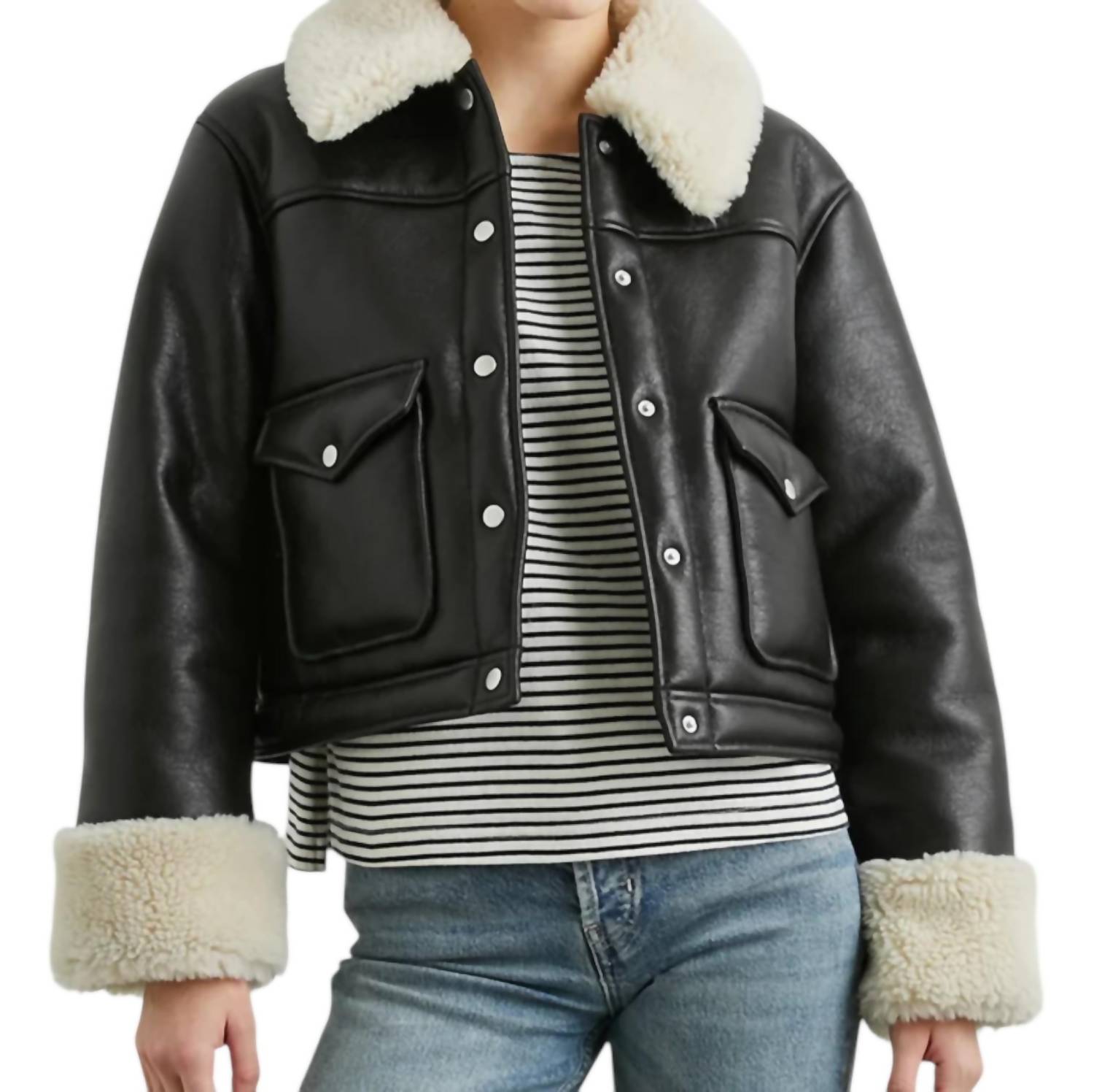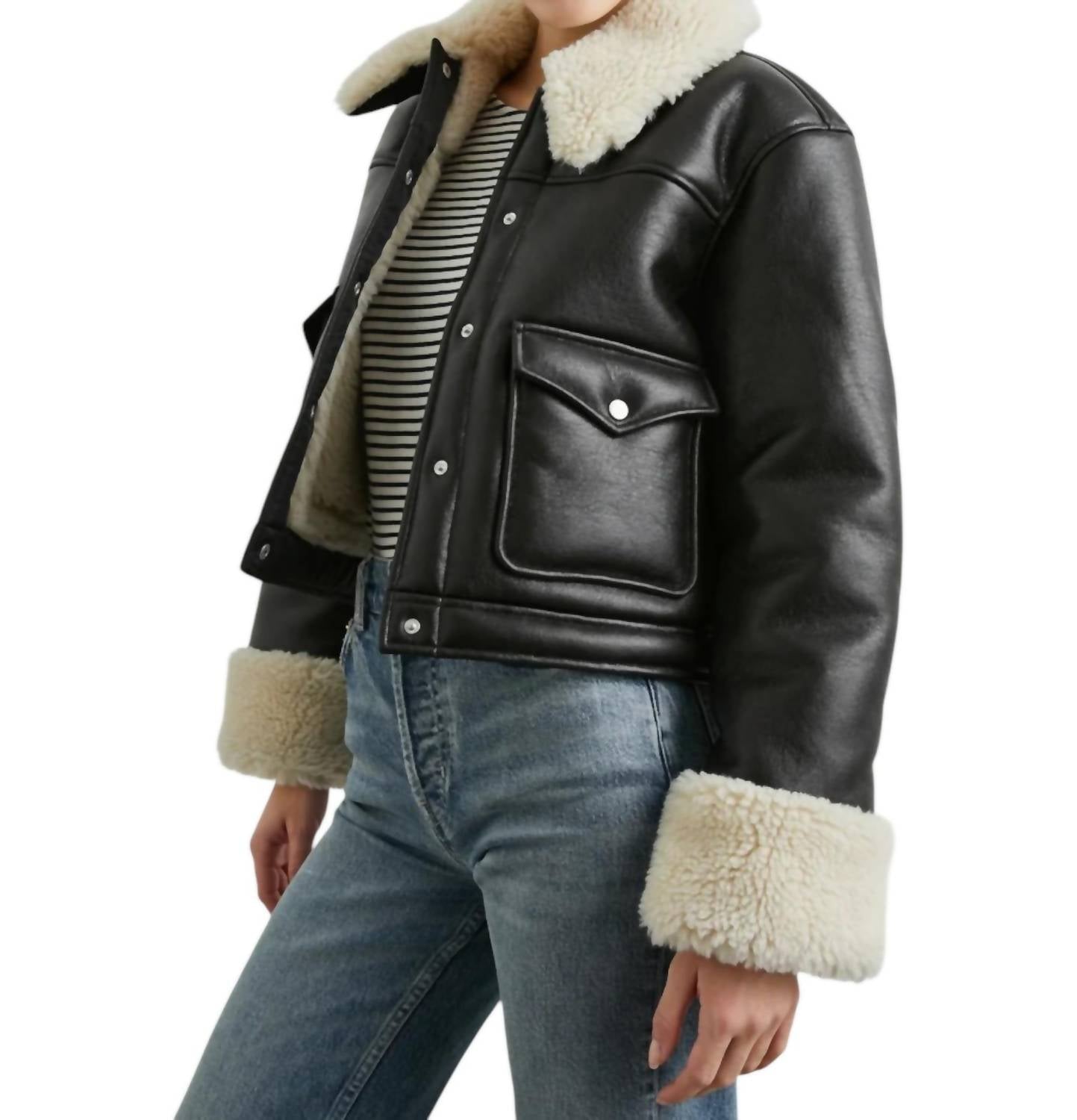 Cropped faux leather design. Shearling lining, cuffs, and collar for warmth. Statement patch pockets with functionality. Silver button detailing. Boxy fit for a modern look. 100% Polyurethane. Hand wash cold, line dry in shade. Imported.