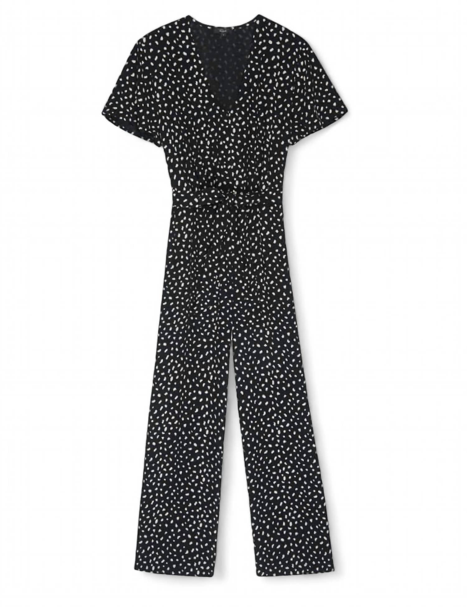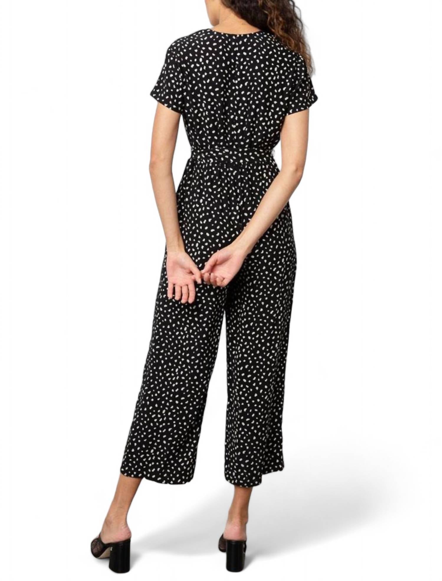 Throw it on and go! Features an ivory spots print and offers short flutter sleeves, a V-neck, and a button-down front. It has wide legs, fabric-covered buttons, front pockets, and an elastic waistline with a removable self-tie belt. Made from 55% rayon and 45% viscose, it should be hand washed in cold water. True to size, the front body length from the highest point to the waist seam is 17 1/4 inches (measured in size Small), and the inseam is 25 1/4 inches. The model is wearing a size Small.