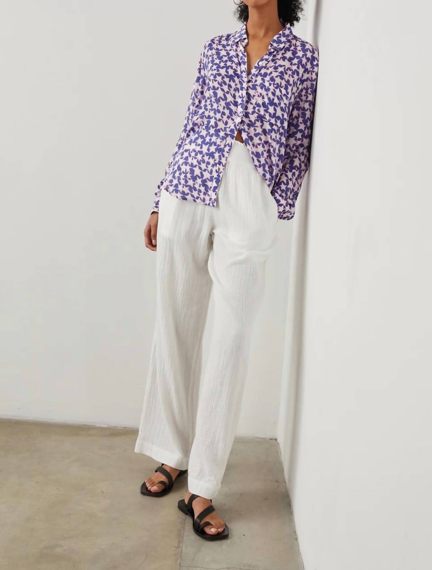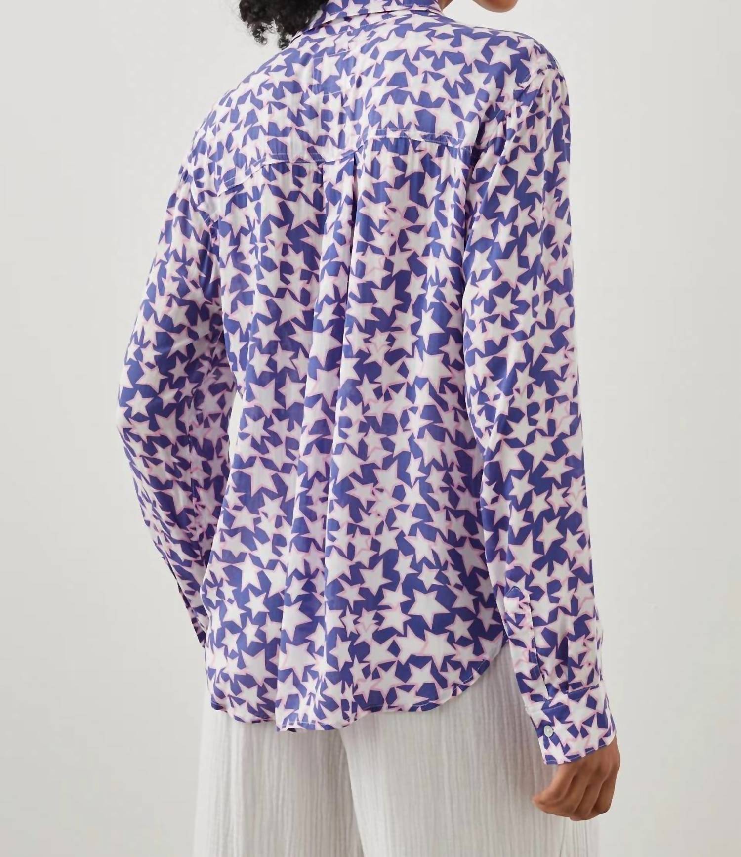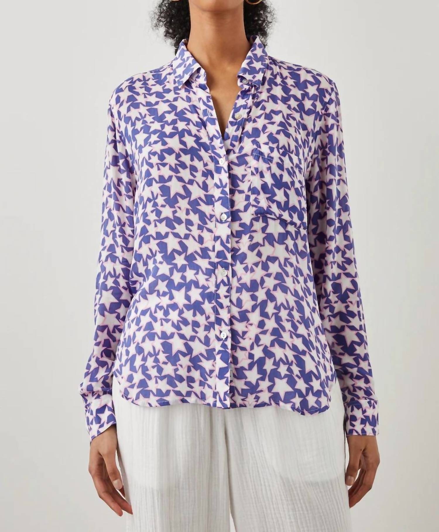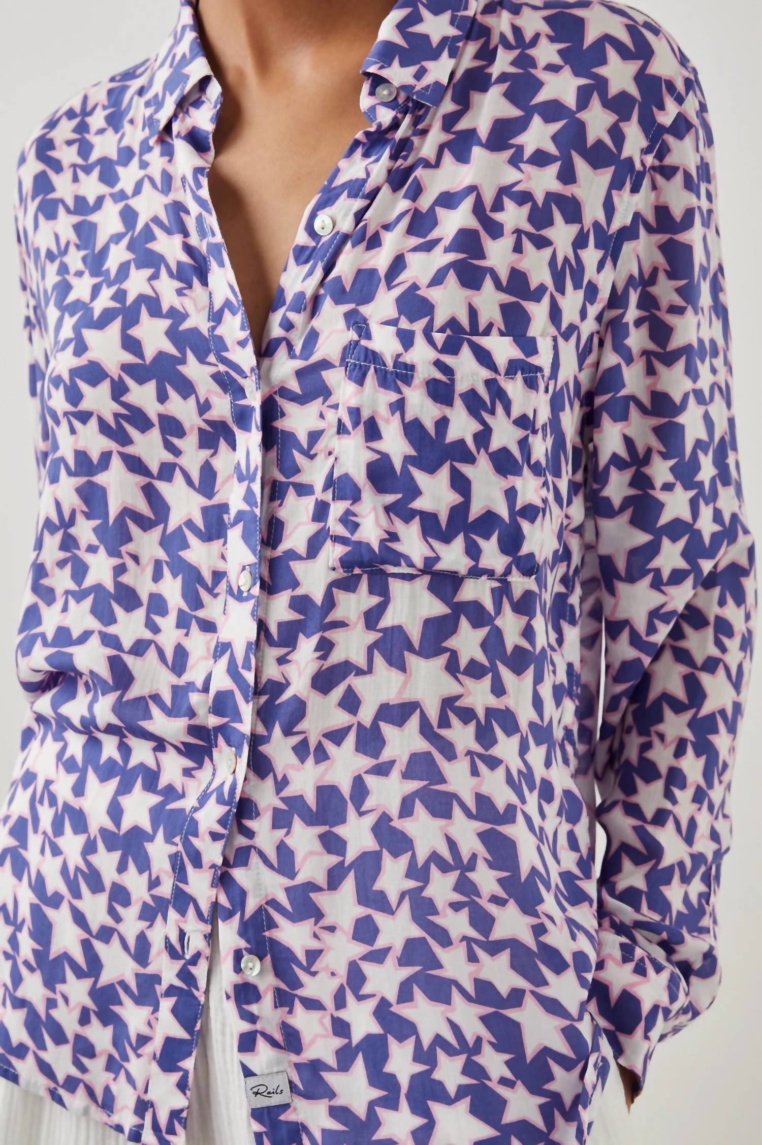 This button down shirt is comfortable yet polished. Elevated and easy to wear, the Josephine Shirt is a foundational piece for your wardrobe. The navy blue button-down features pink-and-white stars and is crafted with super soft, featherweight rayon. It's then finished with premium touches like a crisp collar, chest pocket, and natural shell buttons. 100% Rayon. Imported.