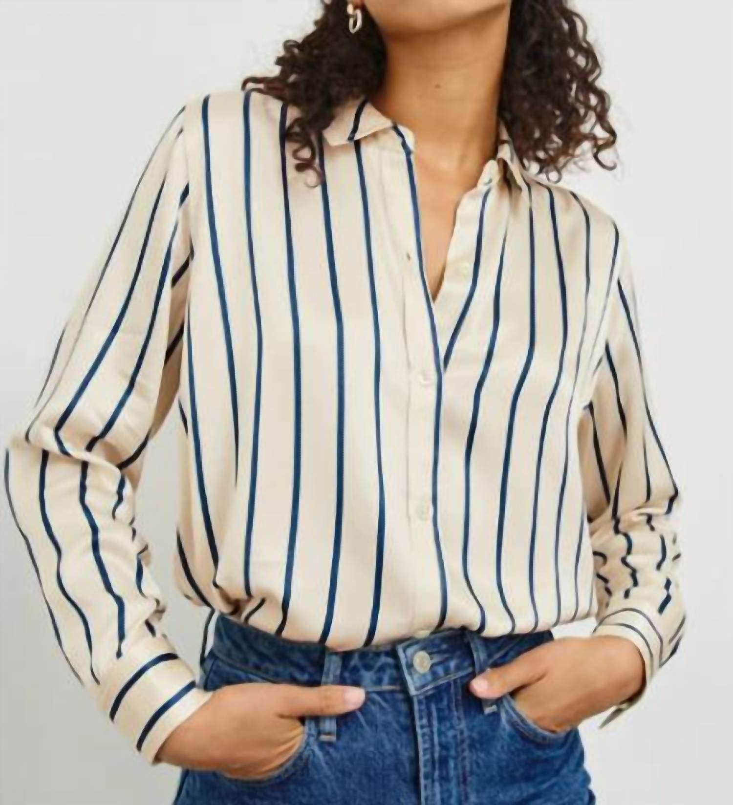 The Maria is a luxurious satin back crepe button-down with a traditional fit. Putting an ultra-feminine twist on the classic shirt, it is finished with natural shell buttons and omits a pocket for a sleek silhouette.