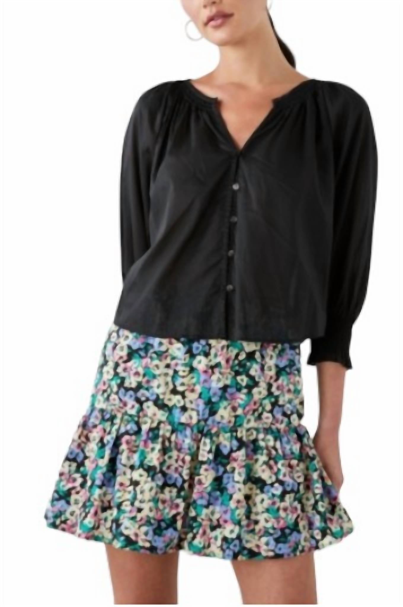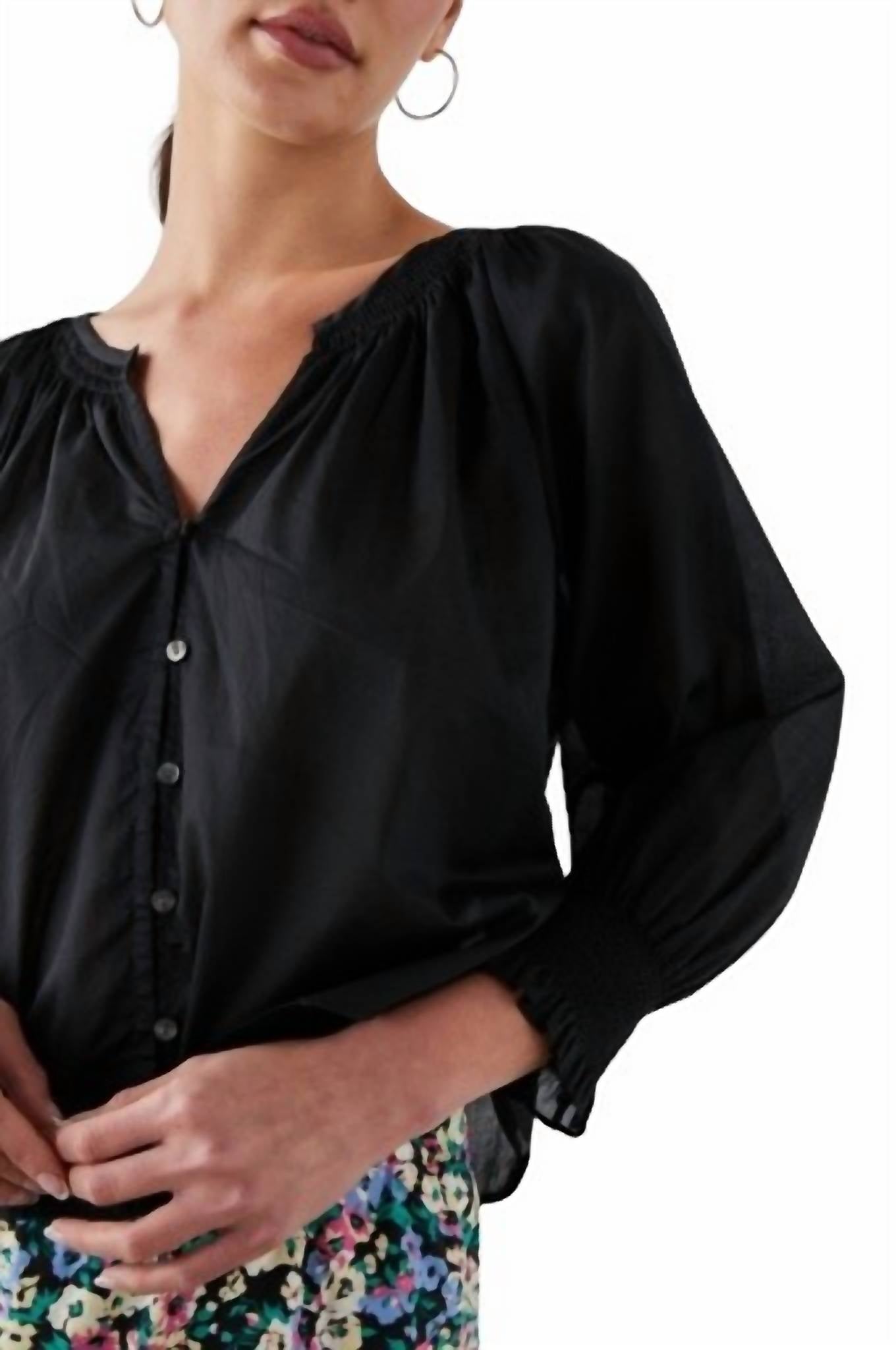 This pretty pullover top features natural shell buttons, elastic smocked detailing at cuffs, and a relaxed fit. Fabric: 100% Cotton.