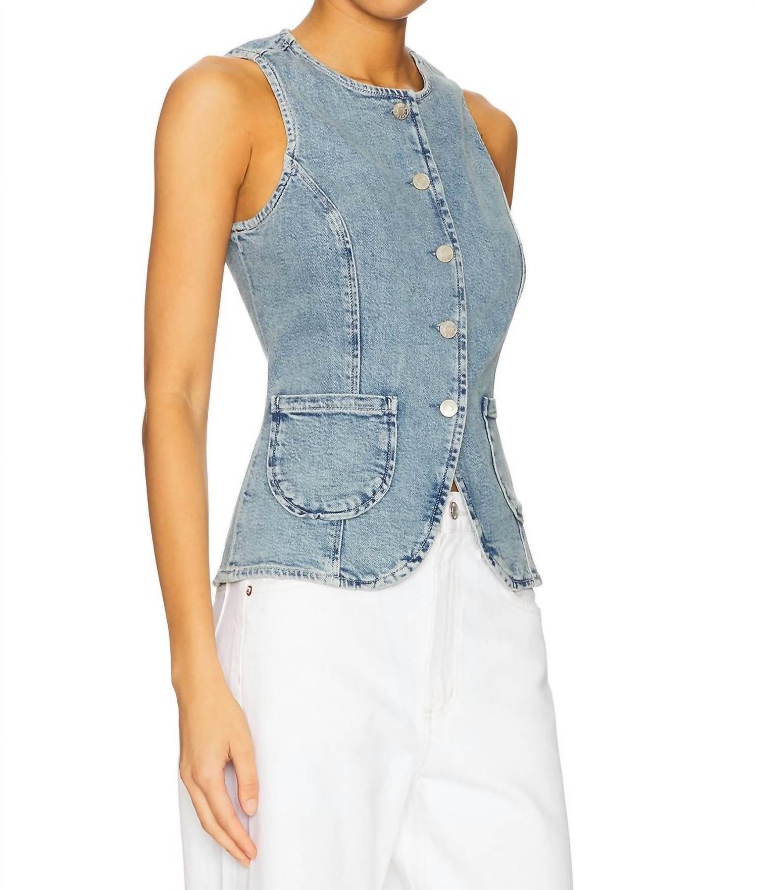 Throw this vest over an all black outfit for a perfectly polished look. Introducing the Portola Vest by Rails, a stylish staple in the Blue Eyed Girl hue. This sleeveless vest features a fitted silhouette with classic front button closures and practical lower patch pockets. Made from 100% cotton, it showcases medium weight denim sourced from Türkiye. Easy to care for, this piece is machine washable.