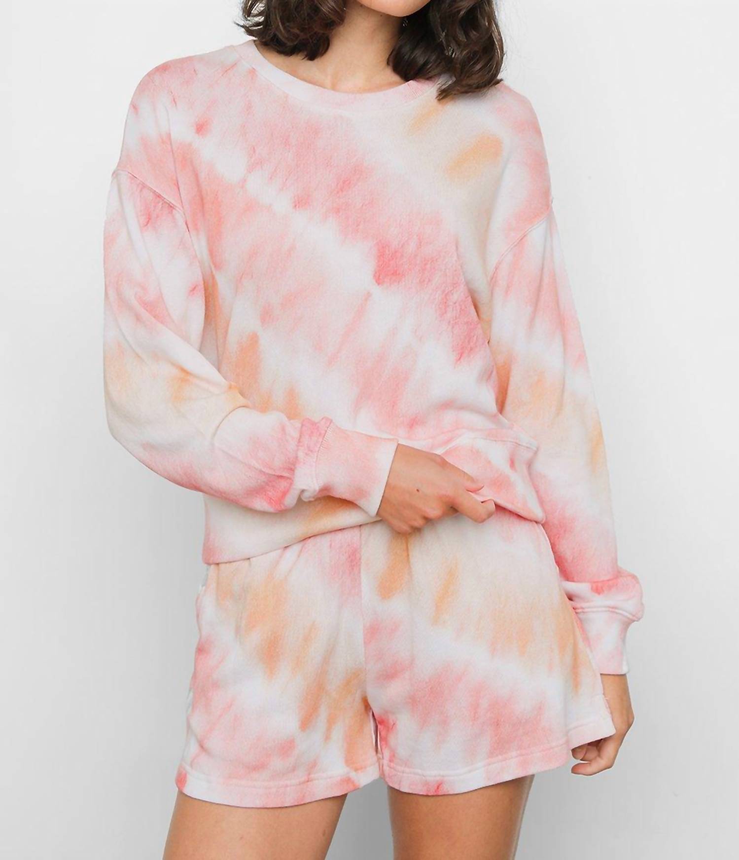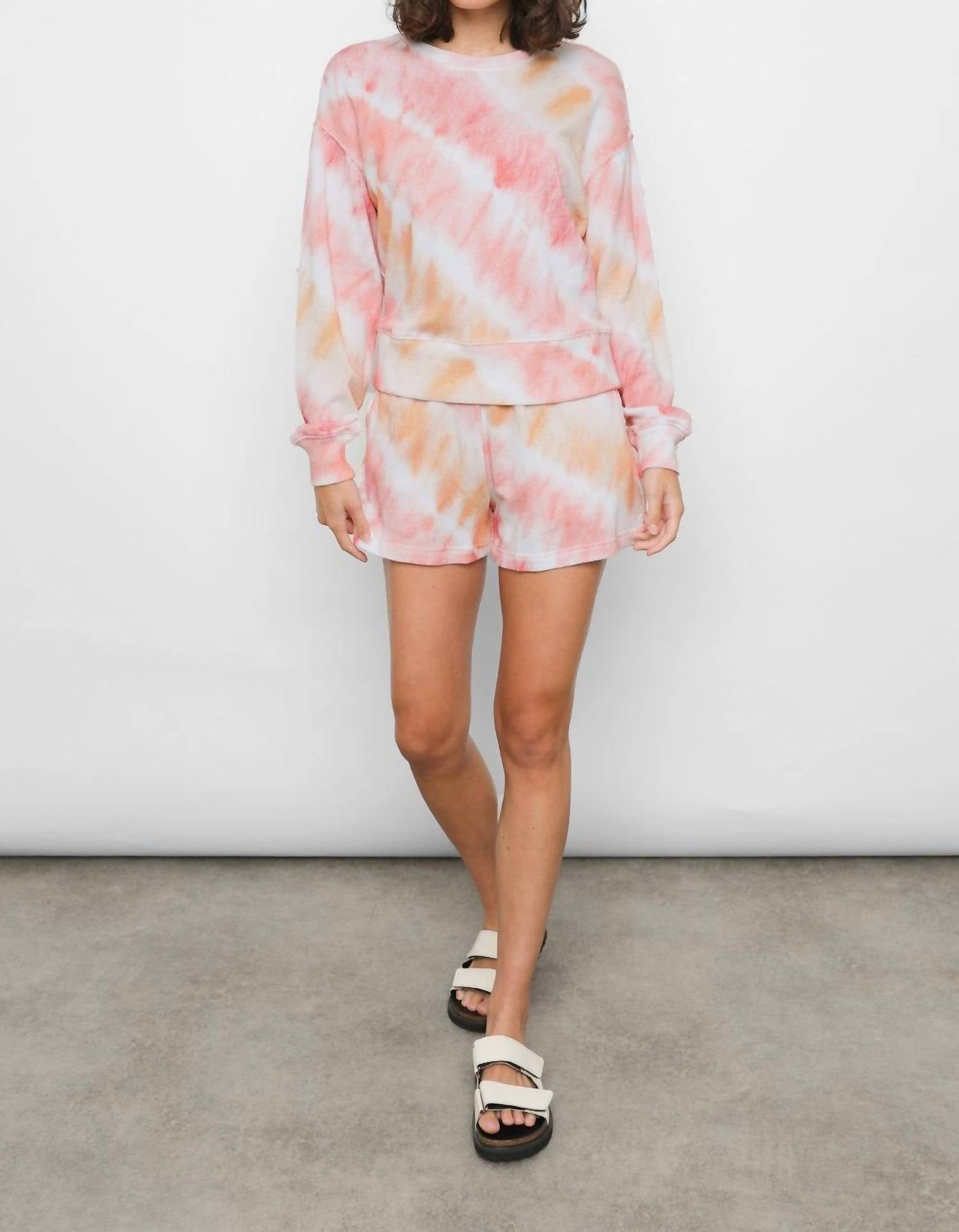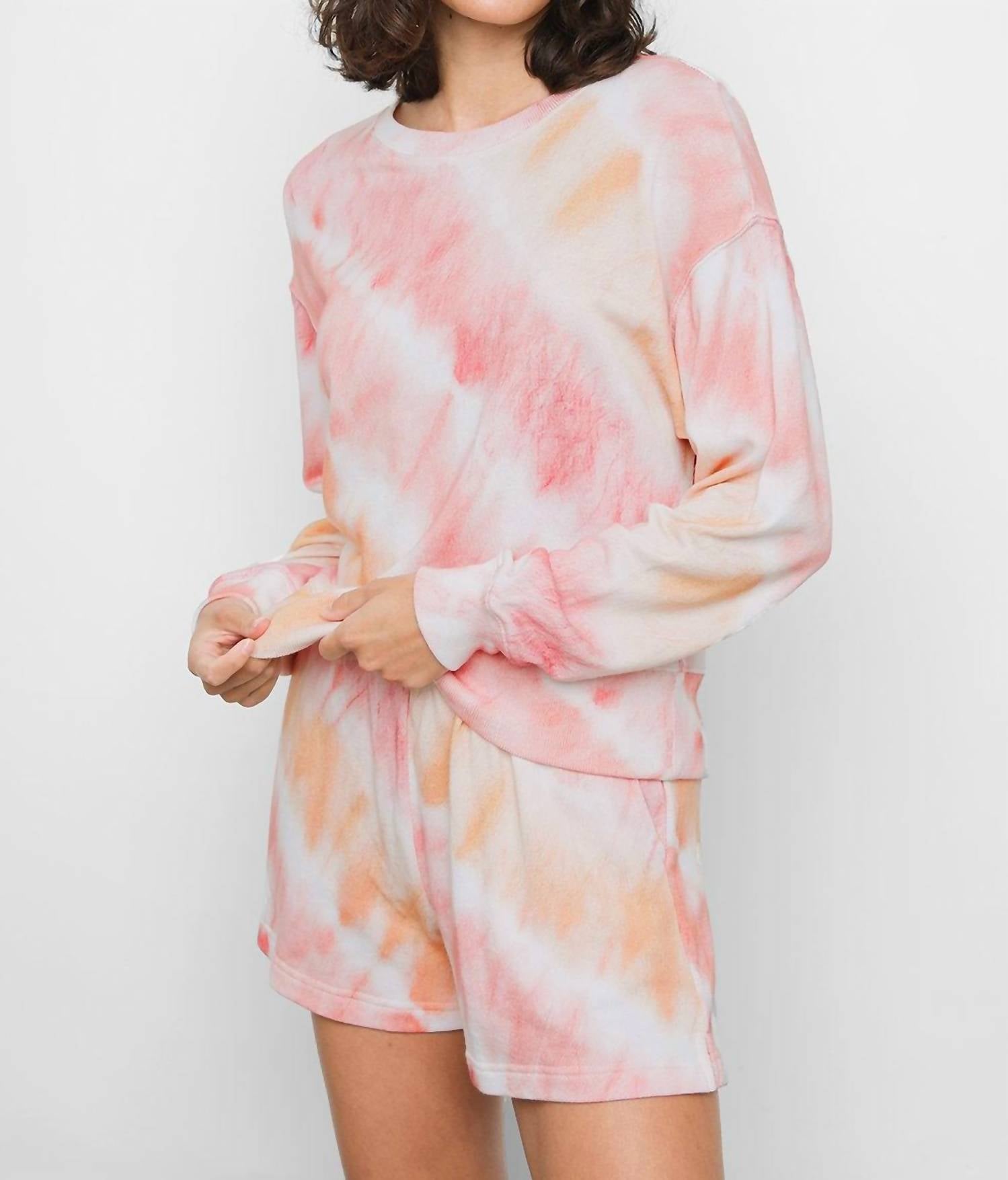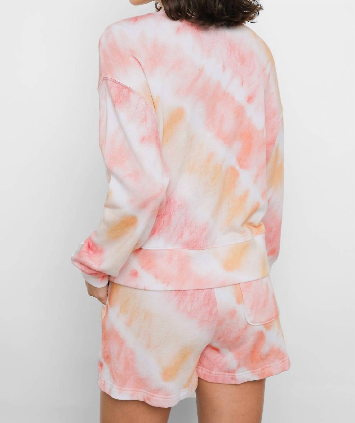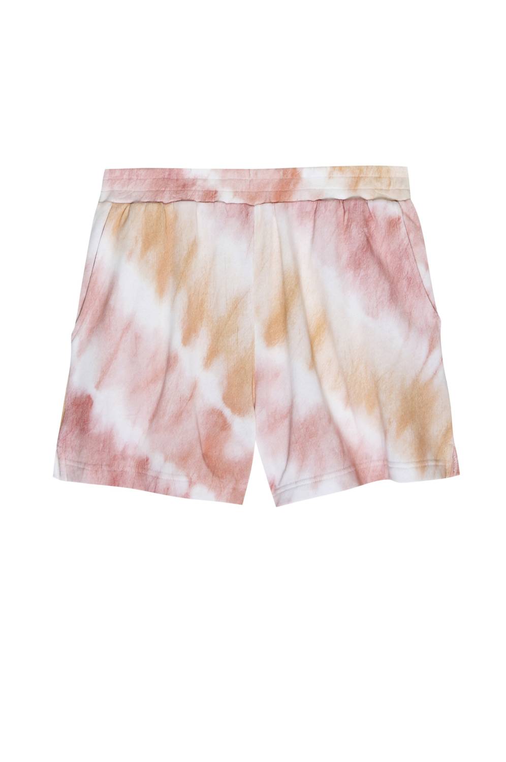 Tuck your favorite tee into these high-waist shorts for a more casual-cool feel.Super soft, relaxed lounge terry, high rise, unlined, soft white sweat shorts featuring peach pink and melon orange dye design throughout, relaxed fit, smocked elastic waistband, front pockets, back patch pocket, wide leg, and flattering side slits. These resort ready, vintage athleticwear inspired pullover shorts are back in a custom, sunset hued tie dye design perfect for summer.Imported.Machine Wash Cold Separately. Gentle Cycle. Do Not Bleach. Tumble Dry Low. Cool Iron If Needed. Or Dry Clean.Recommend ordering true to size.Inseam Length: 3 1/2" (Measured from Small).Front Rise Length: 11".Model is wearing size S.Model’s Measurements: Height 5’9 1/2“, Bust 34", Waist 23", Hips 35".
