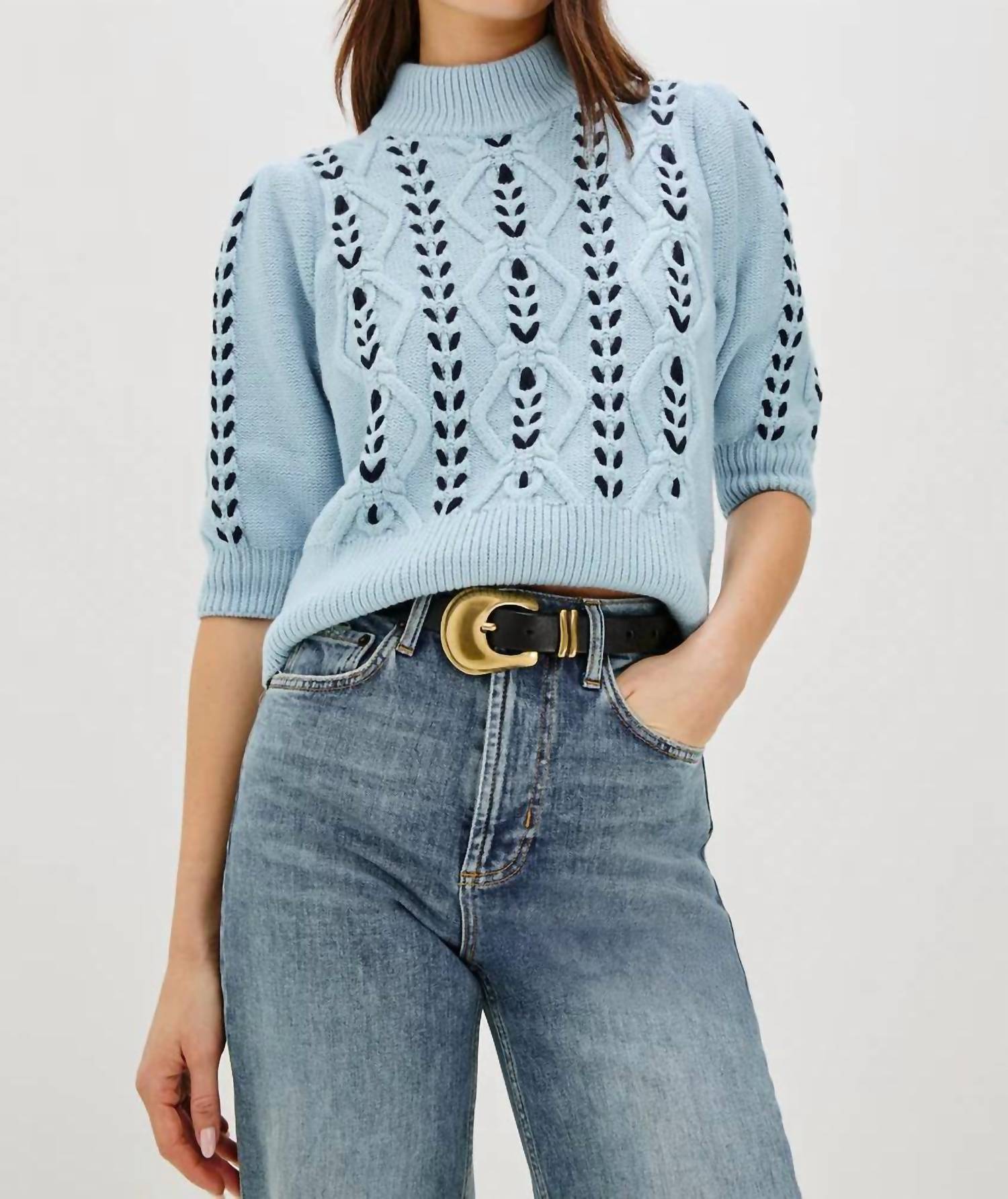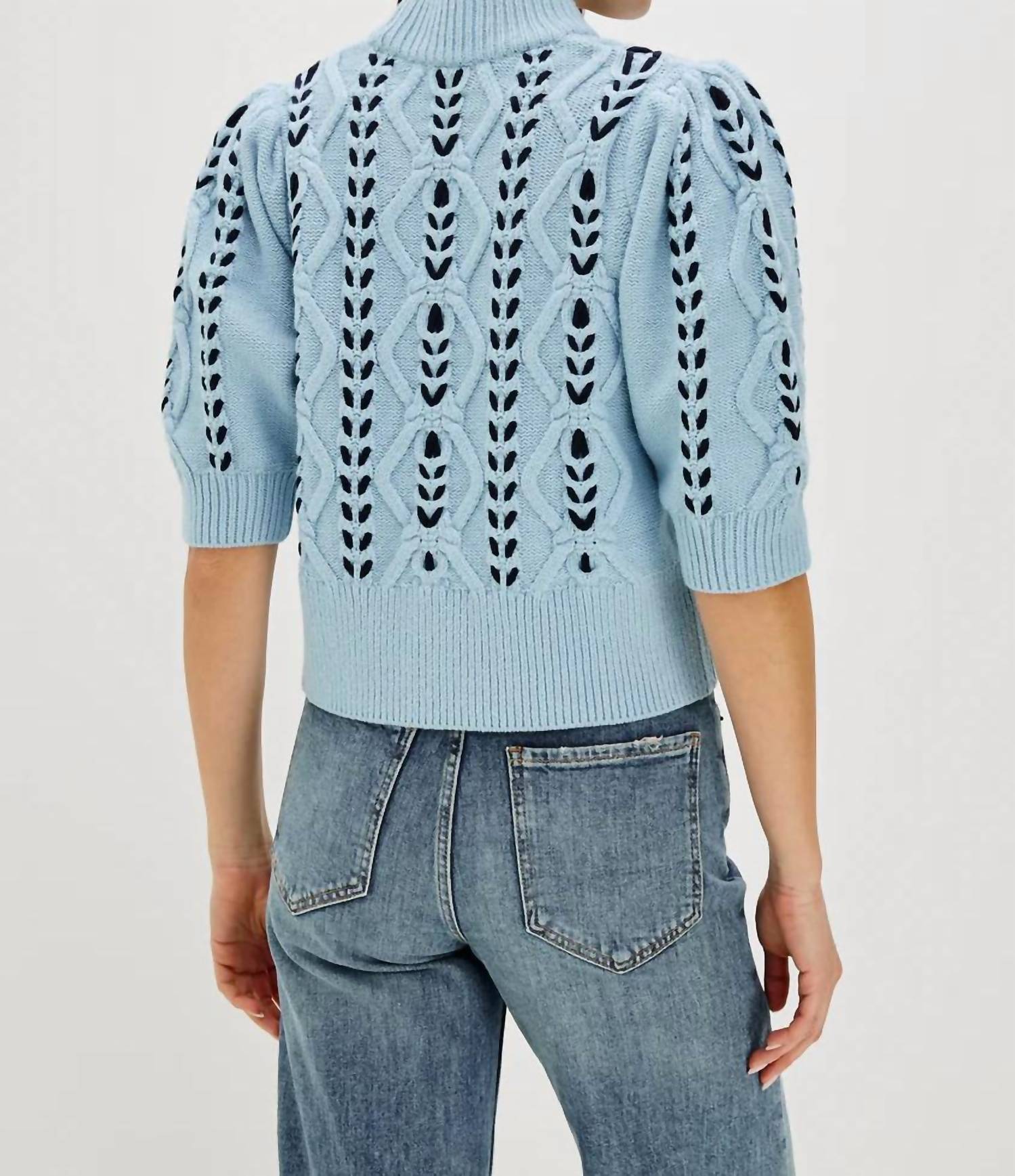 Discover the Women's Addy Sweater by Rails, a semi-fitted design perfect for a touch of elegance. Featuring short sleeves and feminine knit detailing, this navy sweater boasts a mockneck, contrast cable weave, and ribbing at the hem. Composition: 55% Cotton, 37% Nylon, 8% Wool. Imported. Closure: Pull on. Care: Dry clean only, cool iron if needed, do not bleach. Front Body Length: 20" measured from size S.