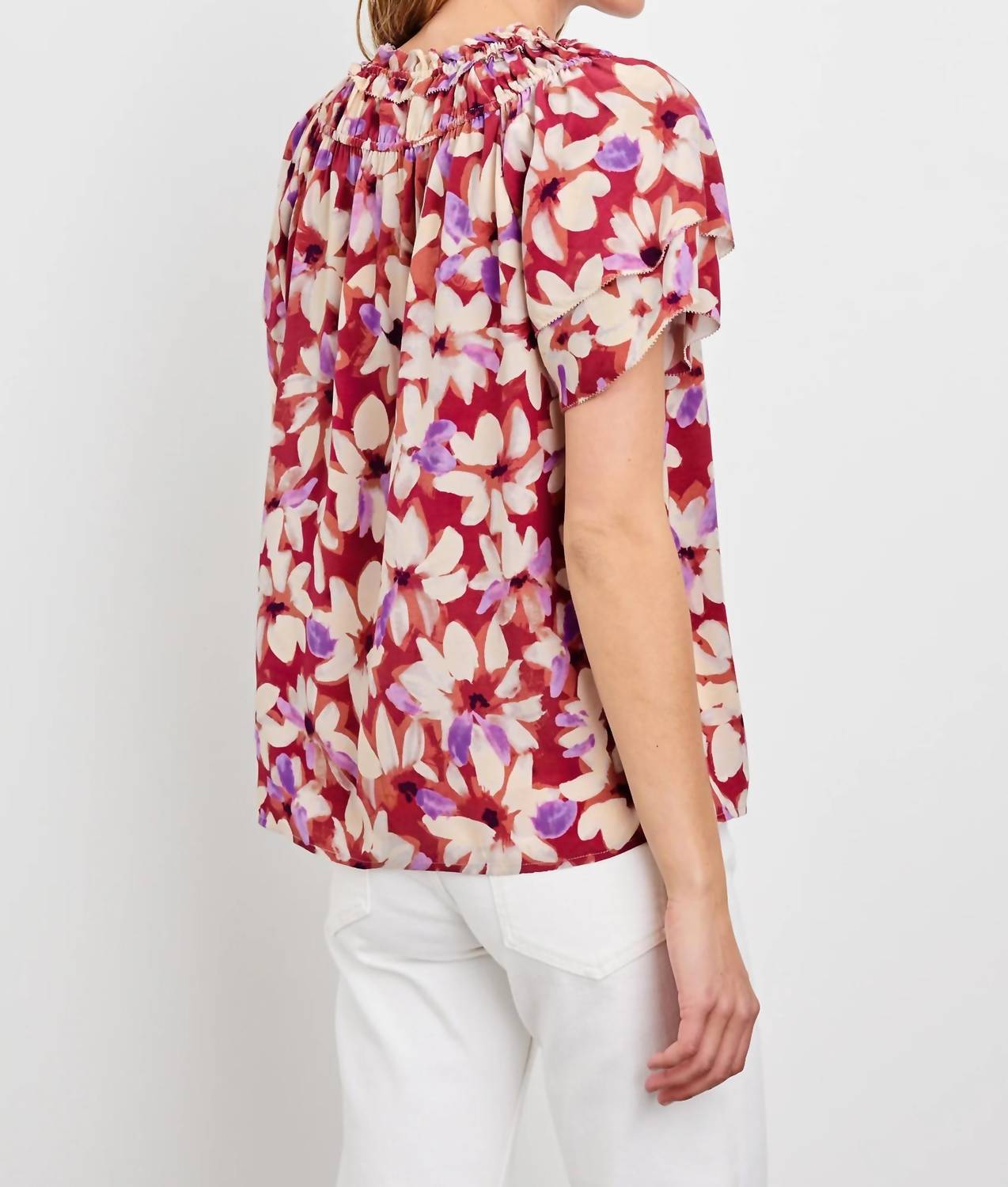 A timeless blouse that will never go out of style. Elevate your summer wardrobe with the Women's Kamila Top by Rails, available in a stunning amaranth hue. This floral blouse boasts a feminine V-neckline and flutter sleeves, enhanced by an elasticized ruffle collar and sole natural shell button. Made from a blend of 61% Rayon and 39% Viscose, it features a side zipper for closure. This piece is imported and measures 24 1/2" in front body length. For the best care, remember it's dry clean only.