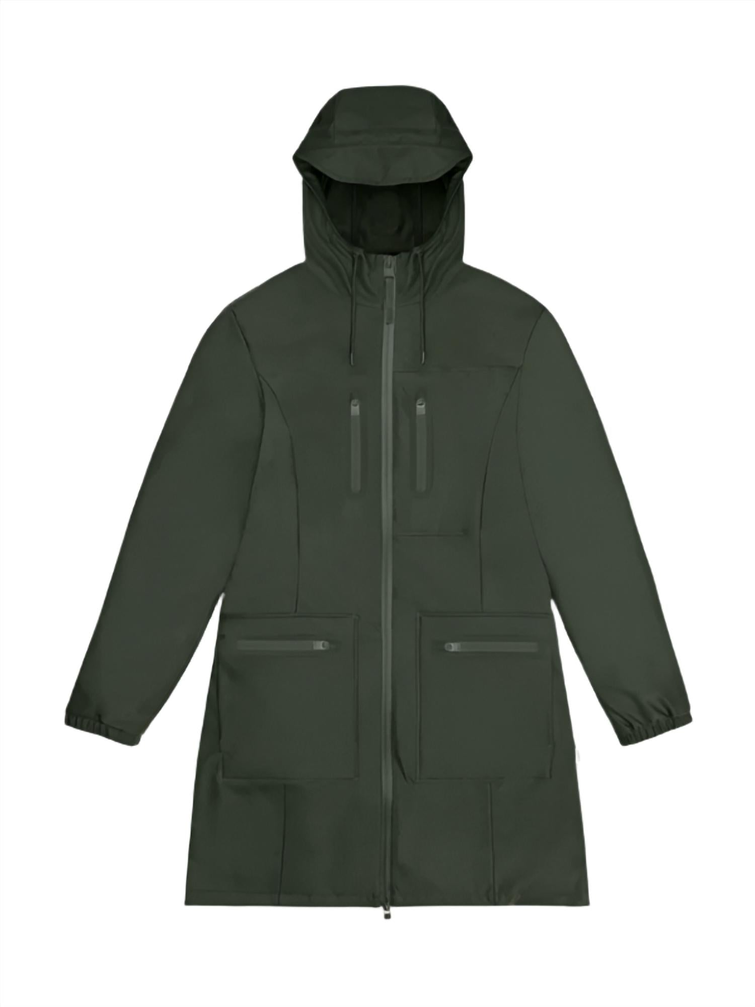 This utility jacket is the perfect combination of cool and feminine. Elevate your rainy day style with the Cargo Curve Rain Jacket W3 by Rains, featuring long sleeves and crafted from 100% polyester for optimal protection. This women's utility jacket showcases a slightly shaped fit to accentuate the waist and is designed with elasticated sleeve cuffs for comfort. Its practical design includes a waterproof zip closure and a hood with a drawstring and built-in cap to shield against the elements. Originating from abroad, this green jacket is highlighted by welded zip-fastening front cargo pockets that add functionality and style. Care: Machine wash.