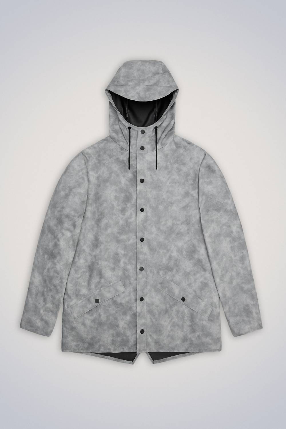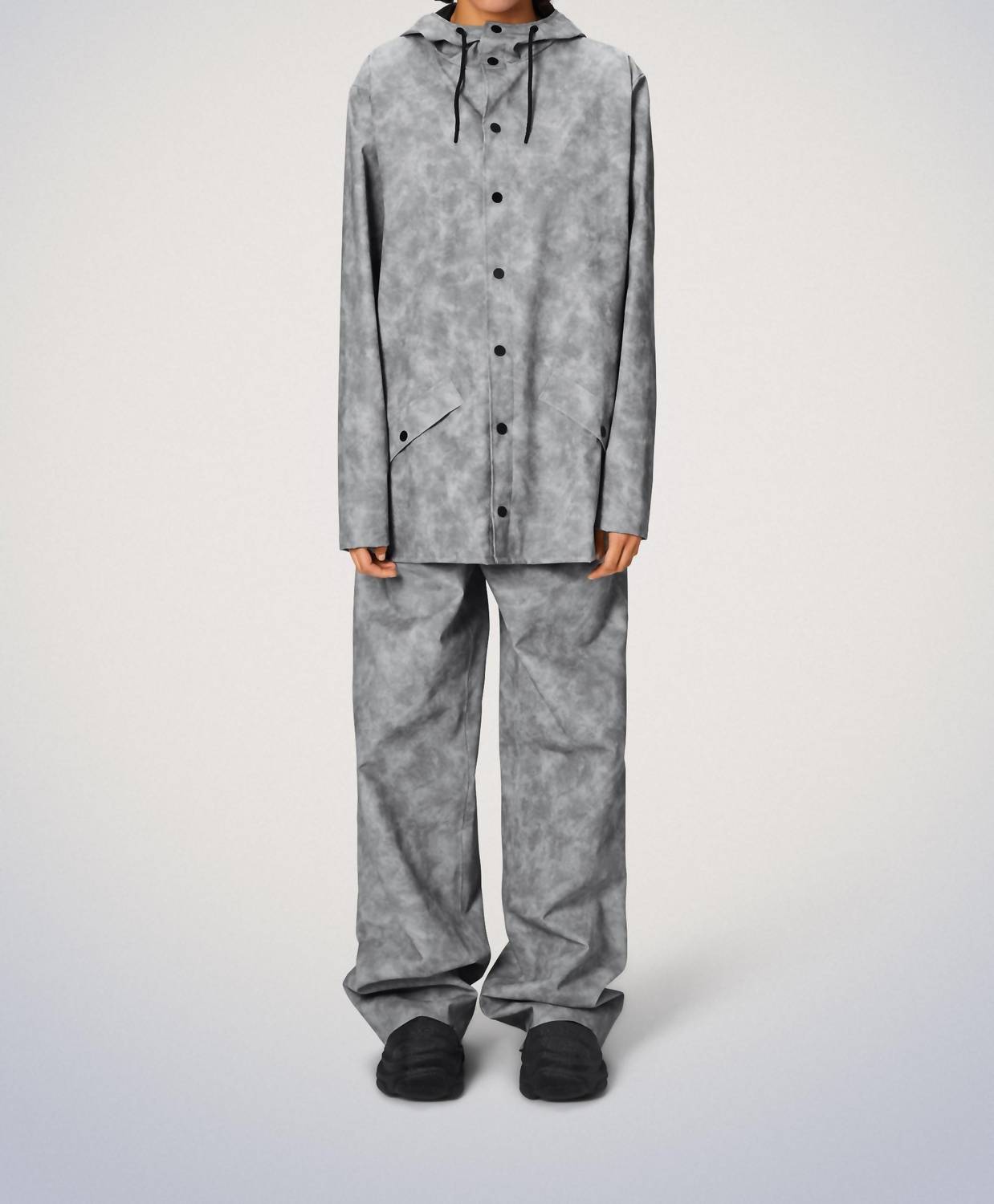 Discover the Snap Closure Raincoat Jacket by Rains, designed for those who demand both style and functionality. This unisex raincoat in Distressed Grey features long sleeves and is crafted from 100% polyester with a durable polyurethane coating. With a casual length of 30.9 inches, it boasts a snap closure, drawing attention to its practicality, including a drawstring hood with a cap brim and double welded slanting flap pockets. Care is hassle-free with machine washing recommended, making it an ideal choice for travel and Scandinavian style lovers. Model is 5′ 9″ and wearing a size M. Measurements in inches—chest: 48, bottom: 48, shoulder: 20.4, sleeve: 26, length: 31.