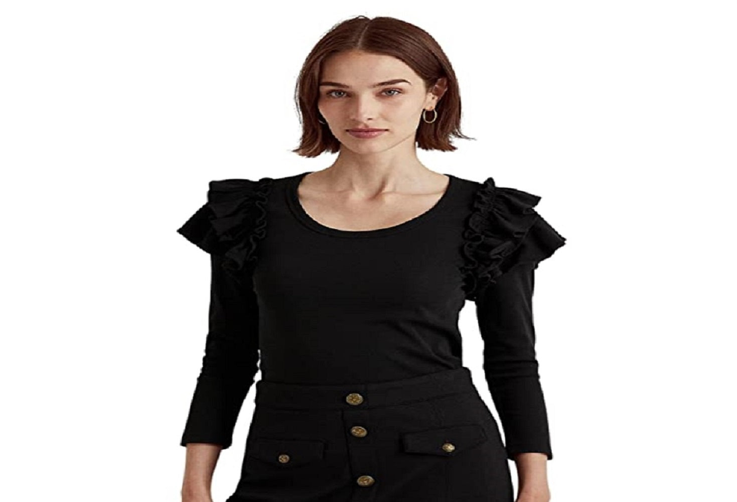 Ralph Lauren Women's Ruffle Trim Stretch Cotton Top Black Size X-Large