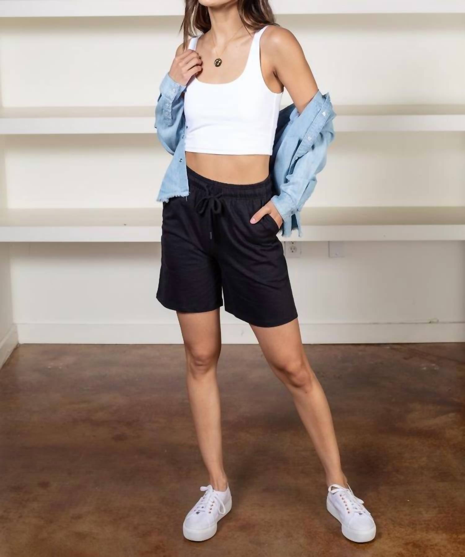 High-waist is here to stay and we especially love this style short. Elevate your activewear with the Fernandez Drawstring Short by RD Style, crafted in a go-with-everything black hue. These women's shorts feature a high-waisted design with a comfortable pull-on closure and a longer length for versatile styling. Made from 100% cotton, they provide comfort and breathability with a 4.5-inch inseam, complemented by on-seam side pockets and a single back patch pocket. For effortless care, simply machine wash cold and lay flat to dry.