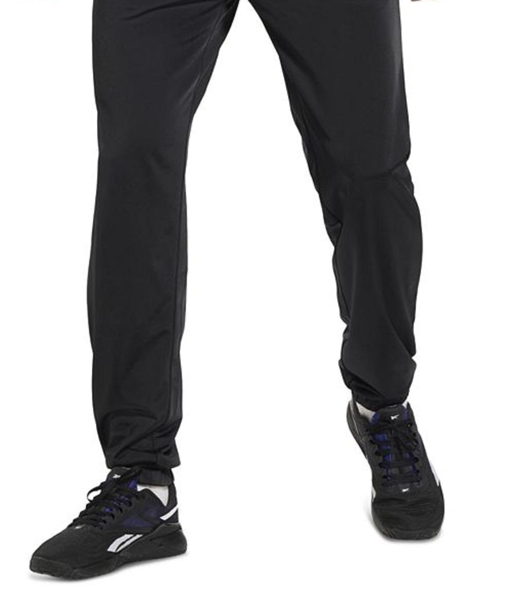 A comfortable pair of track pants is a wardrobe staple. You'll want to add this pair from Reebok to your collection. Silky-smooth tricot fabric combined with the tapered design gives them a sleek| minimalist feel. Elastic cuffs stay put when you move| and side pockets keep small items close.| Athletic fit| Elastic waistband with drawstring closure| Two side hand pockets| Logo print at left thigh; elastic cuffs