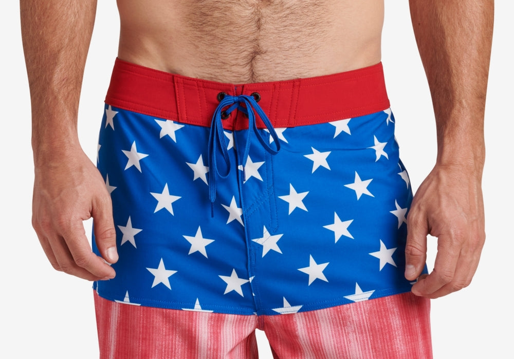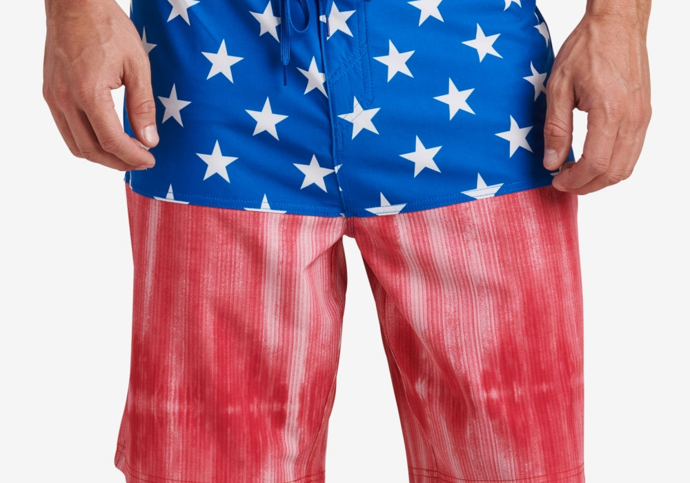 These shorts are red| white| and you| With stars up top and a twist of tie-dye on the bottom| you'll be a free spirit in these 4-way-stretch shorts| Super durable| and the elastic-plus-draw cord waist keeps you comfortable