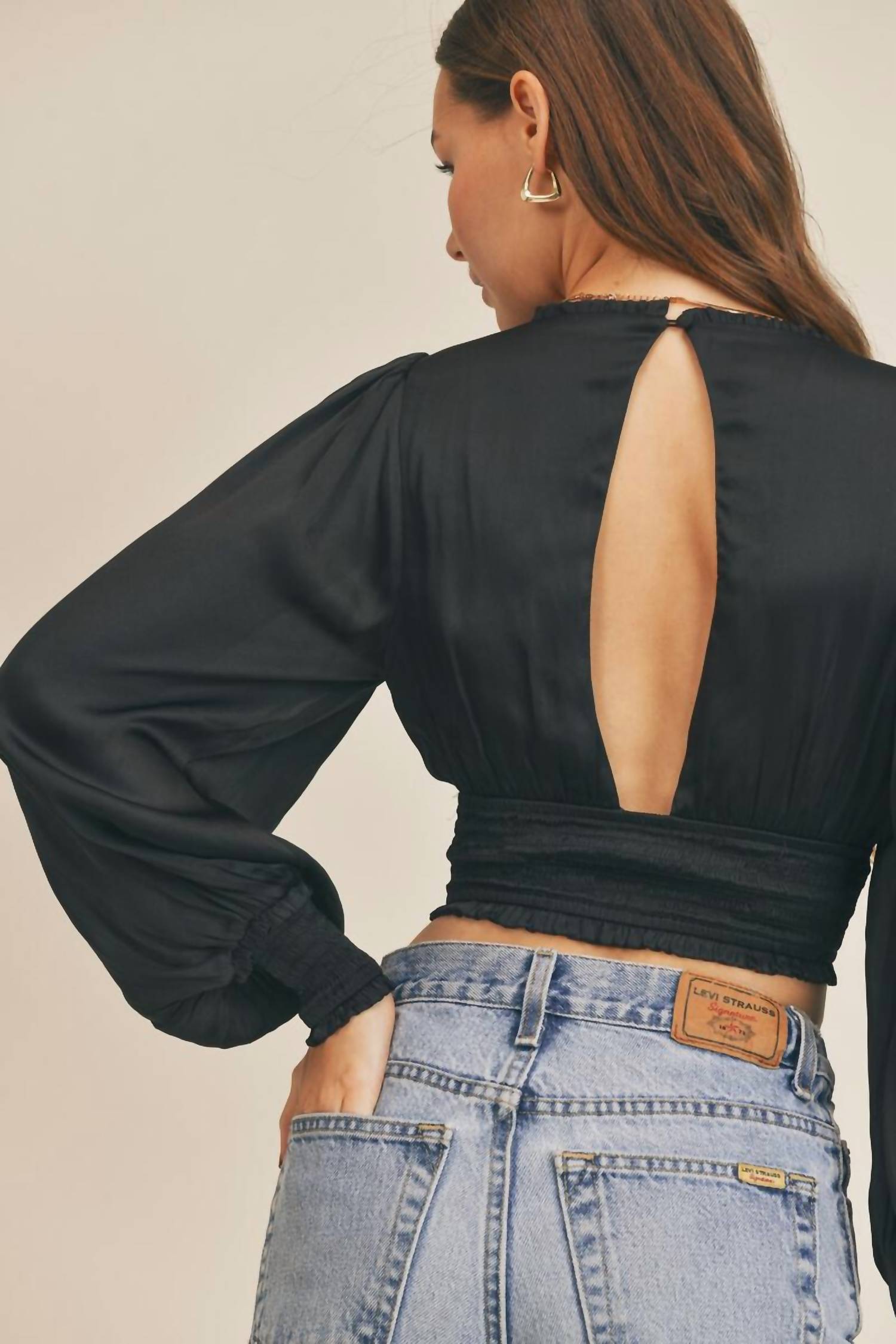 Show a little skin in this cute and casual crop top. The Fallon Top in black is a chic crop top designed to blend elegance with contemporary style. Crafted from smooth 100% polyester fabric, it offers a sleek, silky texture that drapes beautifully. The sophisticated V-neckline enhances the neckline with a refined touch, while the cinched wrists add subtle volume and tailored detail to the sleeves. A flexible elastic band at the waist ensures a flattering fit and comfortable wear throughout the day or evening. Perfect for pairing with high-waisted trousers or skirts, this top effortlessly combines polished style with modern flair. Model is wearing a size small.