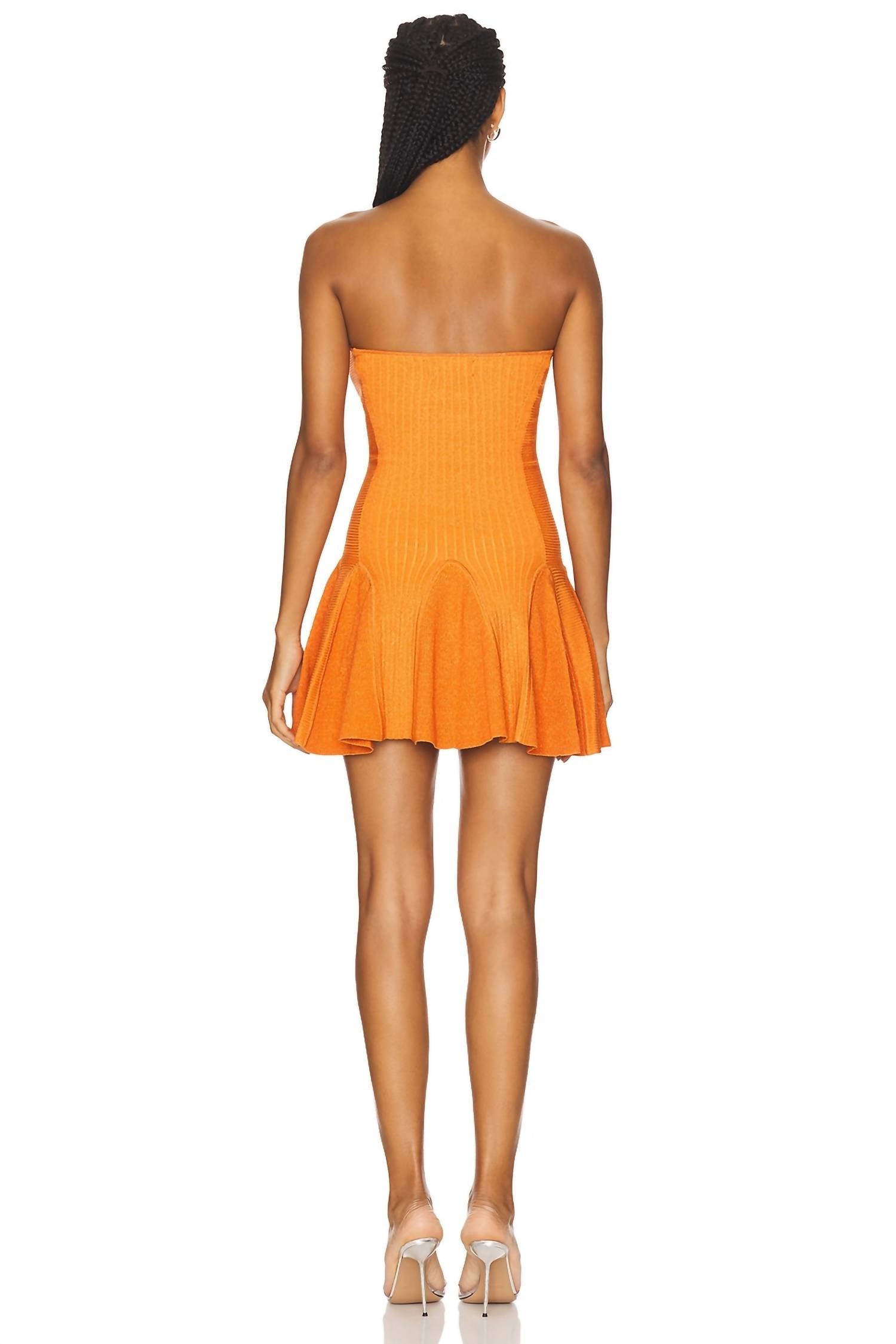 Show off just the right amount of skin in this adorable assymetrical dress. Make a bold statement with the RETROFETE Annina Knit Dress in a striking metallic aperitivo hue. This strapless bodycon dress flaunts an off-the-shoulder neckline and a playful ruffle hem, creating a flattering silhouette perfect for a cocktail party or special occasion. Expertly crafted from 60% Rayon, 32% Nylon, 3% Spandex, and 5% Metallic, this textured, Y2K-inspired piece is made in China and offers a comfortable pull-on closure. Model is 5'10" wearing a size S.