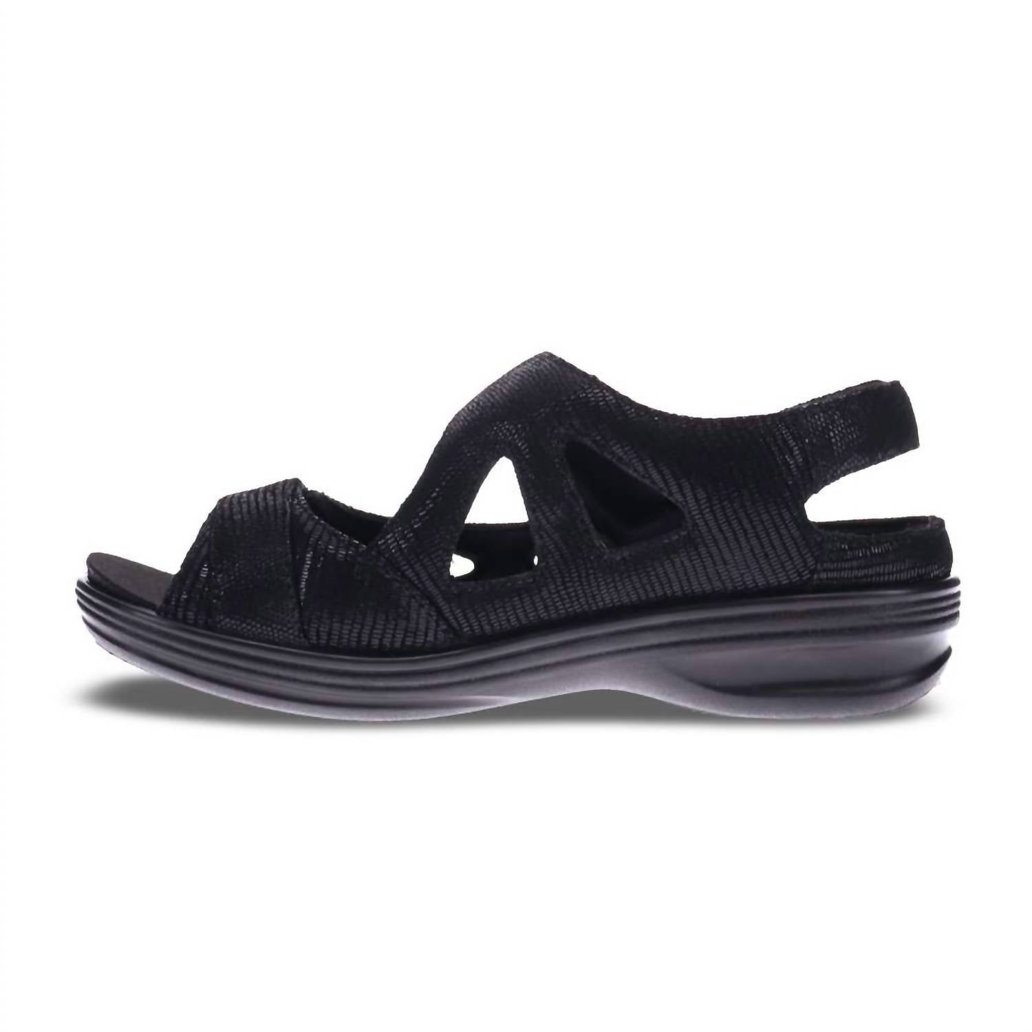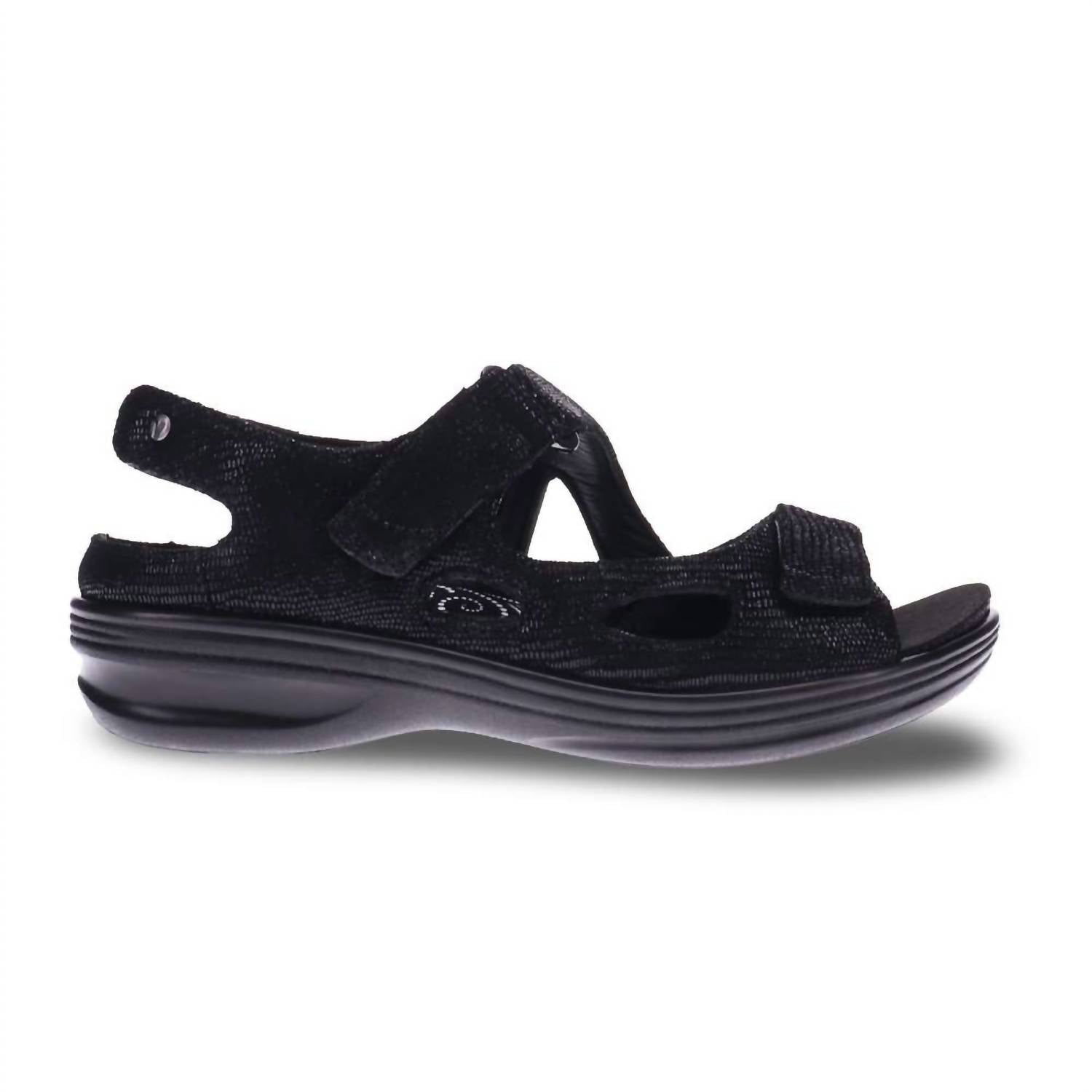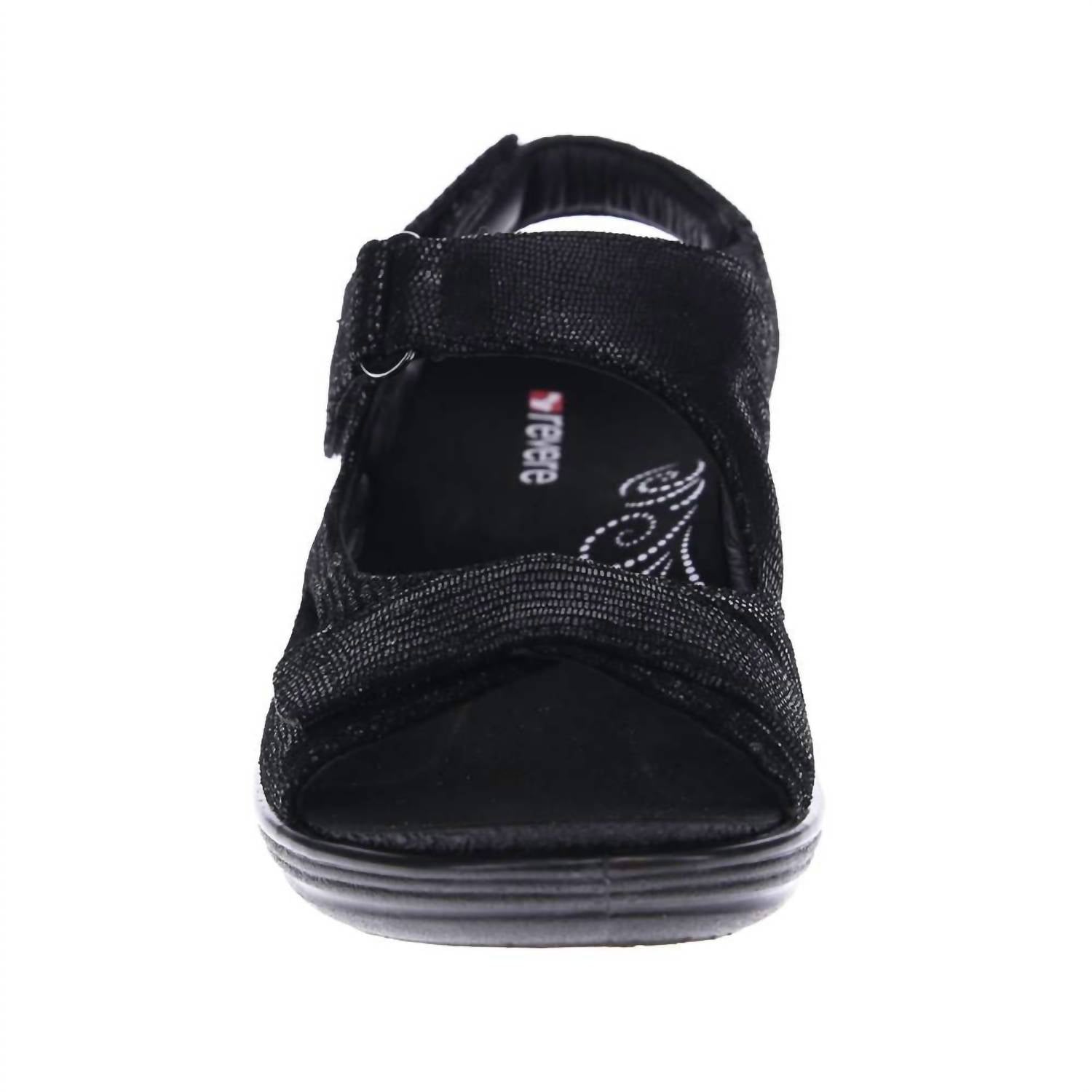 This sandal will take you from brunch to dinner and everything in between. Elevate your summer travels with the Women's Astoria Adjustable Strap Sandal by Revere, crafted in a stylish Black Lizard design. Featuring a microfibre comfort insert treated with anti-microbial properties, these sandals promote optimal foot health while minimizing odor. The orthotic-friendly design includes a removable deep comfort insert and additional depth to accommodate custom orthotics, with adjustable uppers ensuring a perfect fit. Slip-resistant outsole provides secure footing, and included matching strap extensions offer personalized styling options. To clean, simply wipe with a damp cloth and air dry under indirect sunlight to maintain their integrity. Recommended for whole sizes 5-11; if between sizes, order the next size up. Heel height is a comfortable low wedge (1 1/4"-2") with a round toe shape.