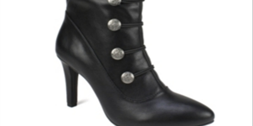 Ornamental buttons adorn Rialto's Chung booties with a hint of vintage inspiration while a sleek stiletto heel lends modern lift.| 3-1/2 stiletto heel| Shaft height; 7-1/2; Circumference; 12-1/2; measured on a size 6| Almond-toe dress boots with zipper closure| Loop and button accents at upper| Cushioned insole for added comfort; treaded sole for added traction| Manmade upper; fabric lining; manmade sole