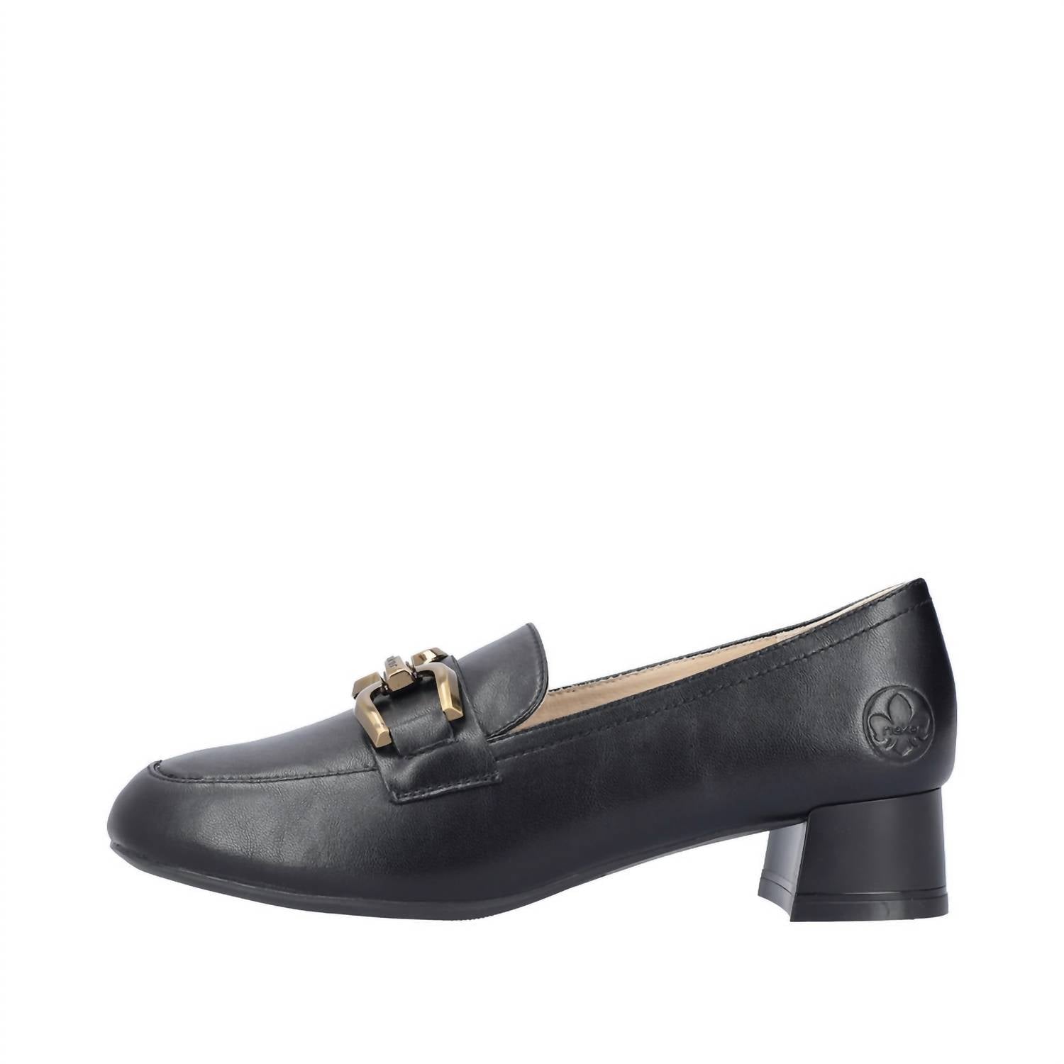 A preppy yet feminine take on the classic loafer. Discover the Women's Violet 52 Heeled Loafer by RIEKER, crafted for the perfect blend of comfort and style. These glossy black loafers feature premium leather composition, ensuring durability and a smooth finish. With a classic design enhanced by a decorative golden accessory, these loafers offer a slip-on convenience with no fastener. The low block heel and grippy sole provide stability, while the extra soft interchangeable insole and supple leather lining deliver exceptional comfort and breathability.