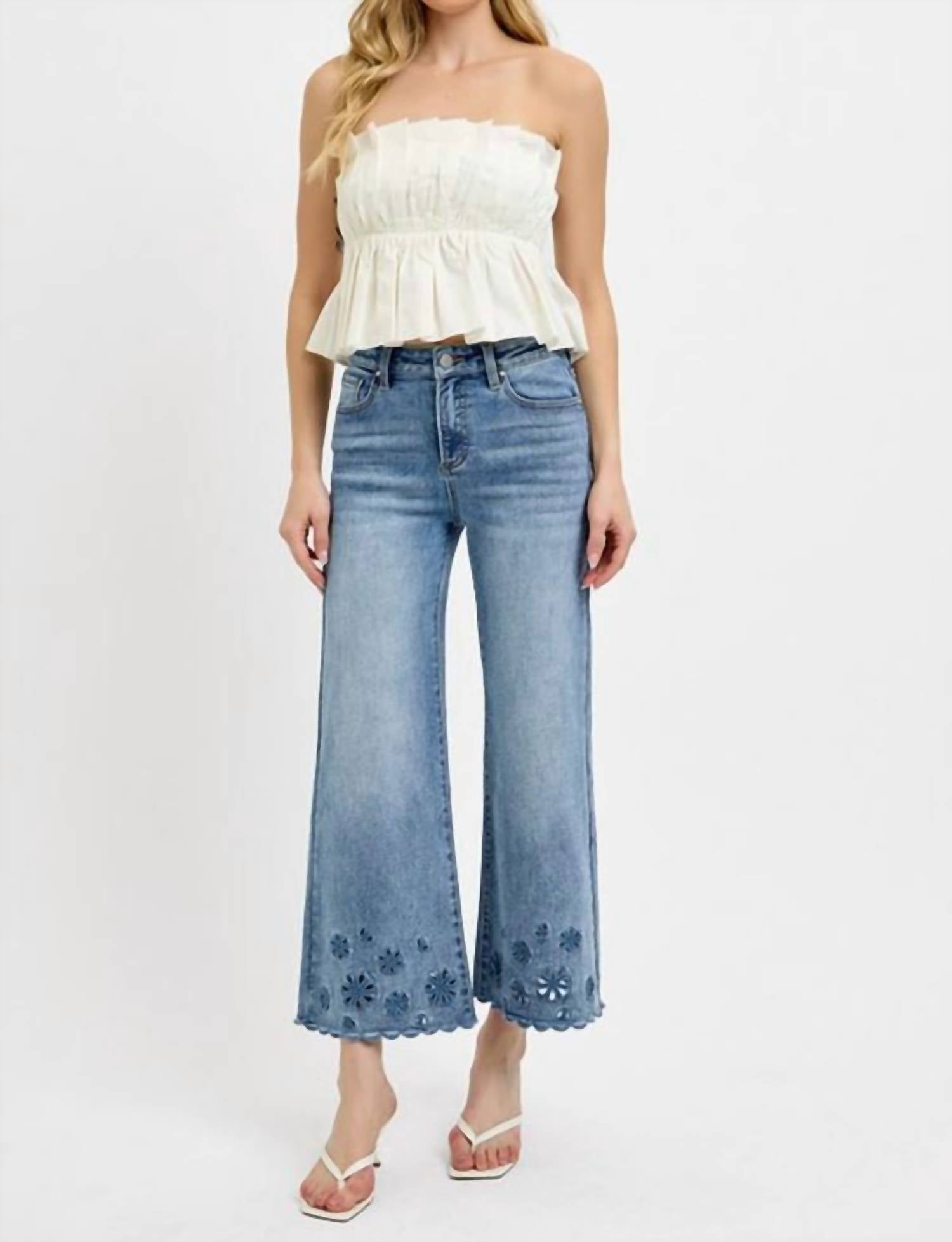 Tuck your favorite tee into these high-waist jeans for a more casual-cool feel. Experience the effortless blend of vintage charm and modern elegance with the Crop Wide Cut Out Detail Jeans by RISEN. These high-waisted, wide-leg jeans are crafted from 68% Cotton, 30% Polyester, 2% Spandex medium-wash denim, featuring a relaxed fit with a 27" inseam and 10.12" rise. The standout detail is the delicate floral embroidery along the scalloped hem, adding a feminine and playful touch to your wardrobe. Closure: Button closure. Care: Machine wash cold.