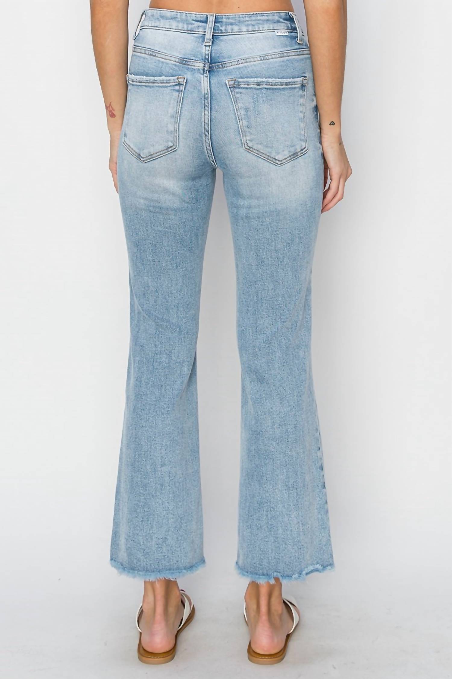The perfect cropped jean for those transitional seasons. 64% Cotton. 30% Tencel. 4% Polyester. 2% Spandex Rise 10 1/2"; Inseam 27" No Distressing Light Wash Stretch