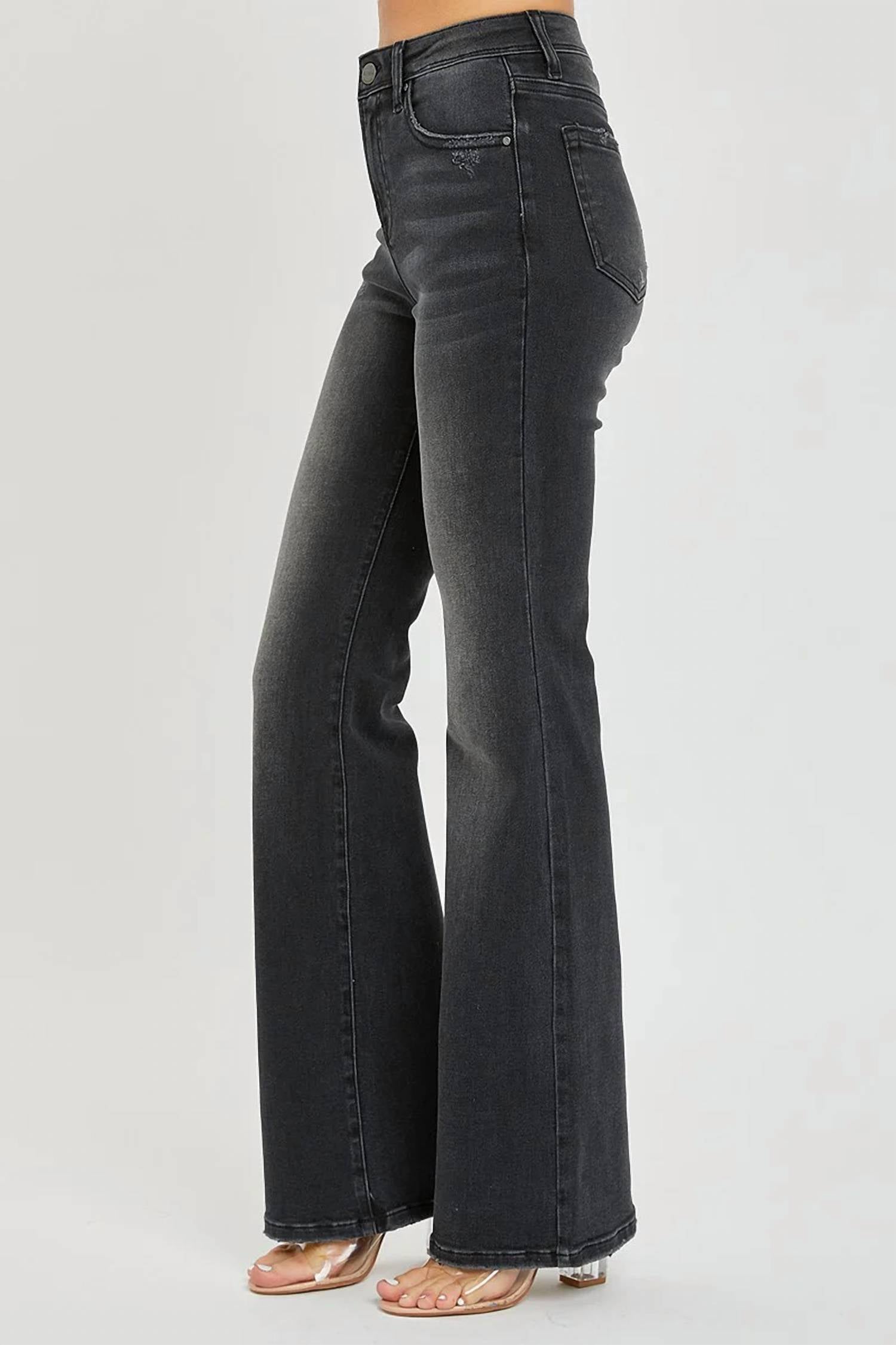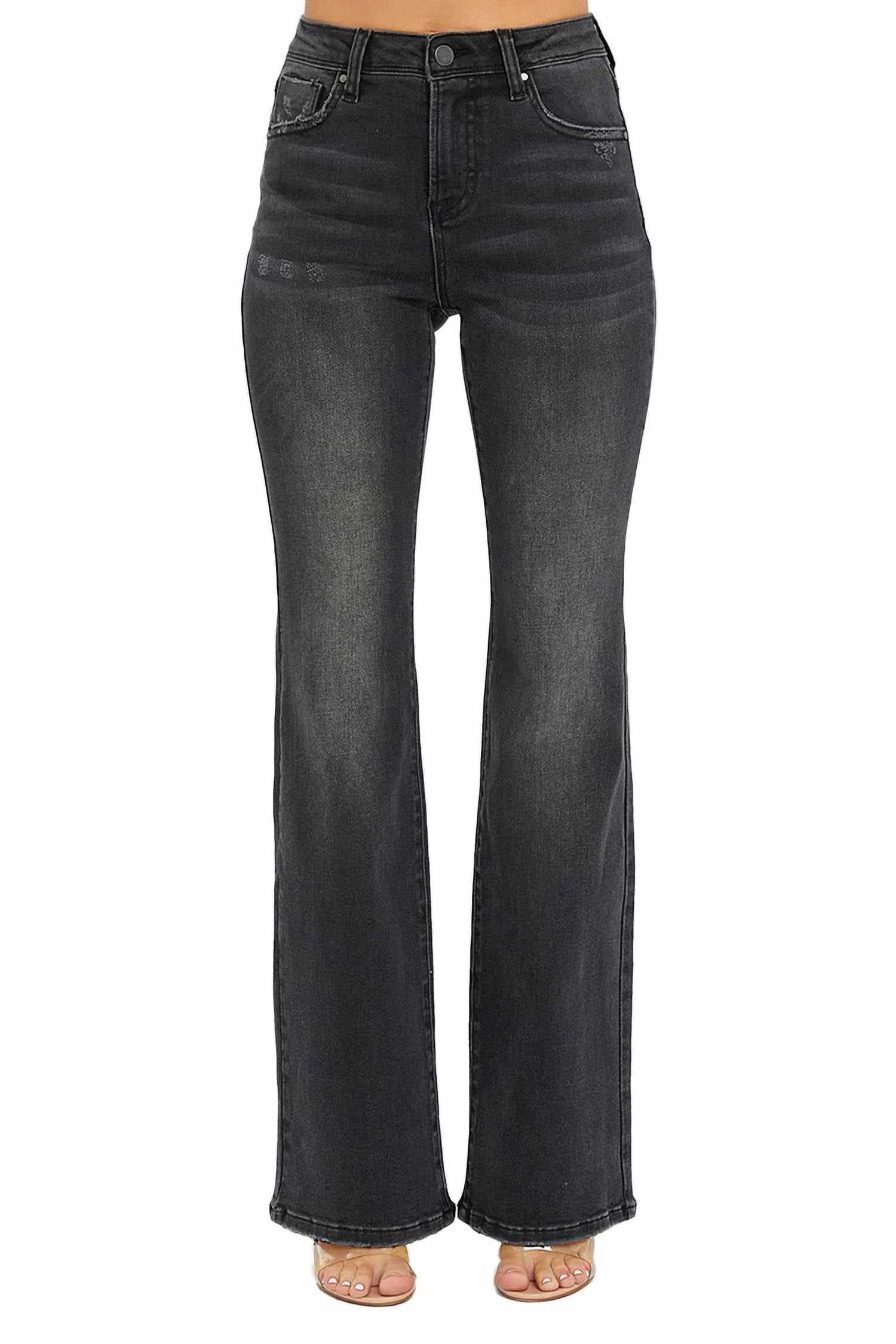 Introducing the Women's High Rise Bootcut Denim Jeans by RISEN, a timeless addition to your wardrobe in a solid black hue. These jeans feature a 33" inseam and a flattering 10" rise, designed to complement any figure with their slimming fit and bootcut leg style. Constructed from 90.5% Cotton, 7.5% Polyester, and 2% Spandex, they offer exceptional comfort and flexibility. Closure: Zip closure. Care: Machine wash and tumble dry. Model is 5'8" with a 24" waist and 34" hips, wearing size 3/26.