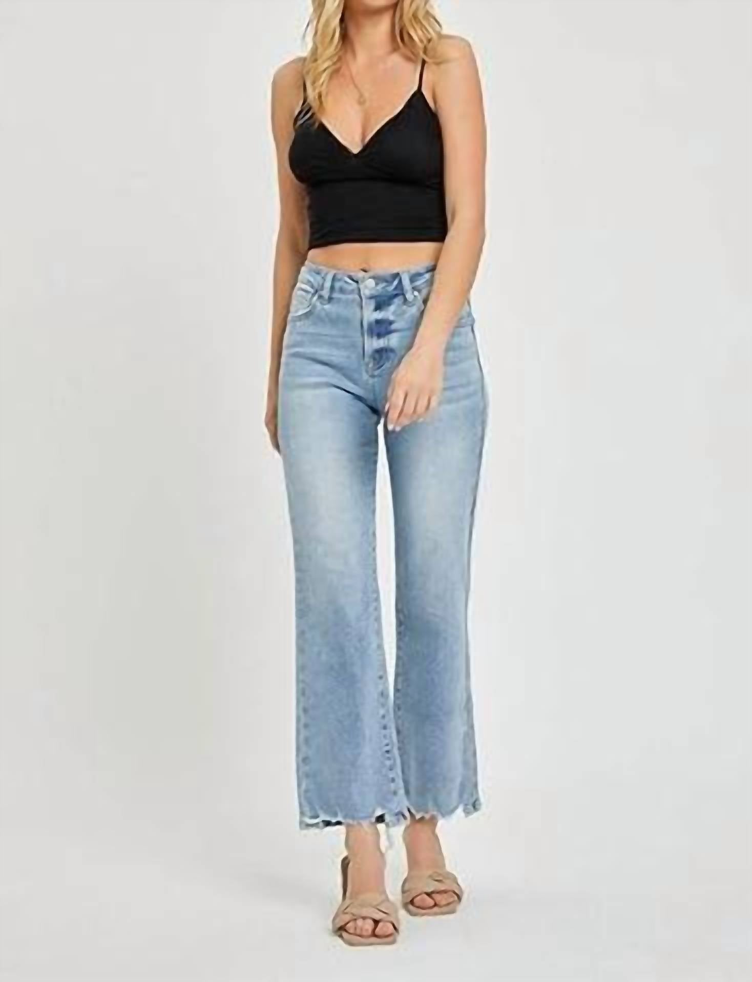 Introducing the High Rise Relaxed Straight Jean by RISEN, crafted for women who appreciate style and comfort. These straight leg jeans are made from cotton and feature a high rise for a flattering fit. In a light wash, the jeans offer a textured look with a raw hem, accompanied by practical pockets and a secure button closure. Perfect for everyday wear, these jeans run true to size, with a recommendation to size down from your even size due to their stretch.