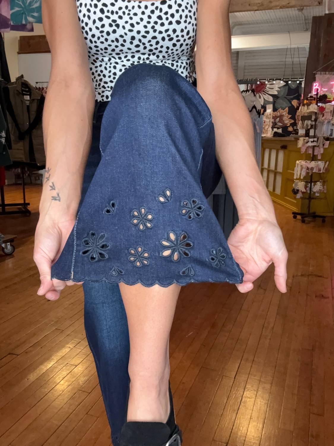 Just as cute as they are comfortable. Introducing the Laser Cut Detail Jeans by RISEN, crafted in a chic dark wash for a streetwear-ready look. These high-rise, flared-leg jeans come with a trendy wide leg and feature unique floral cutout detailing. Made from a blend of 68% Cotton, 30% Polyester, and 2% Spandex, they offer a relaxed fit with a button closure for comfort and style. Measurements for size 3/26 include a rise of 10" and an inseam of 26.5". Care: Machine wash and tumble dry. Available in flare and wide leg styles, perfect for the spring season.