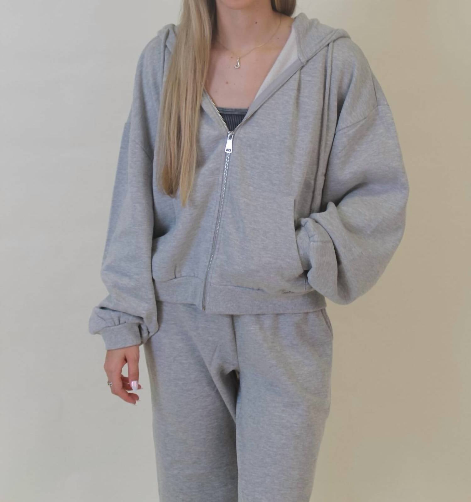 Cozy fabric, impeccable design - Meet the sweatshirt that you'll never want to take off. Stay warm and chic with the RISEN Natalie Oversized Hoodie, crafted from soft knit material in a stylish grey hue. Featuring long balloon sleeves and a hooded neckline, this zip closure hoodie brings modern flair to classic comfort. Its functional pockets make it ideal for lounging, whether paired with matching Natalie sweatpants or your favorite jeans. Designed for women seeking both style and coziness.