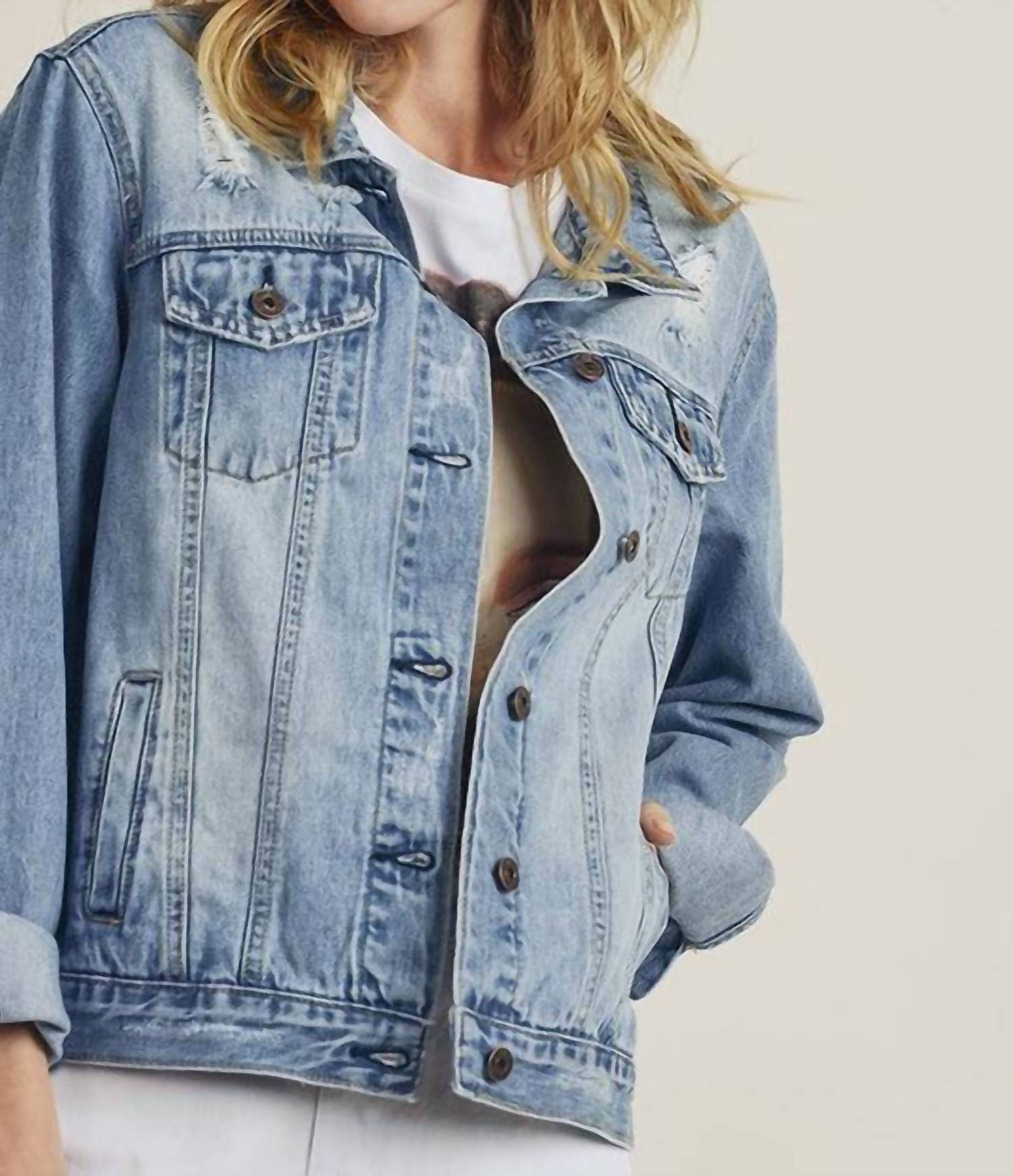 The perfect jean jacket for those slightly crisper days between seasons.Jean jacket with button closure, long sleeves, collared design, and pockets. Features a relaxed fit and is made from 100% cotton. Machine washable for easy care.