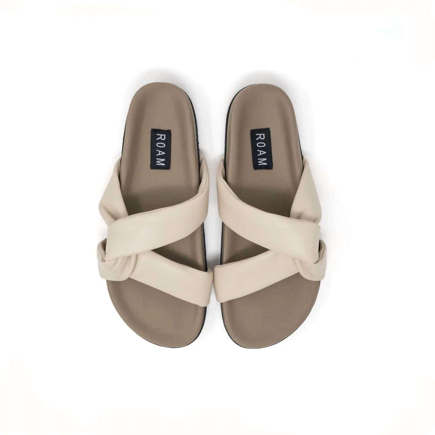 Flowy dresses, cropped pants, and even jumpsuits... this sandal works with them all! Step into comfort and style with ROAM's Women's Side Slip Sandal, a chic accessory for your spring wardrobe in a trendy cream hue. Featuring a vegan leather upper with intersecting straps and a custom contoured neoprene footbed, these sandals promise a snug, flop-free fit. The slip-on design is perfectly paired with a 3/8” tread outsole crafted from sustainable BIO EVA, offering stability and eco-conscious appeal. To maintain their allure, spot clean marks with a soft cloth and water.
