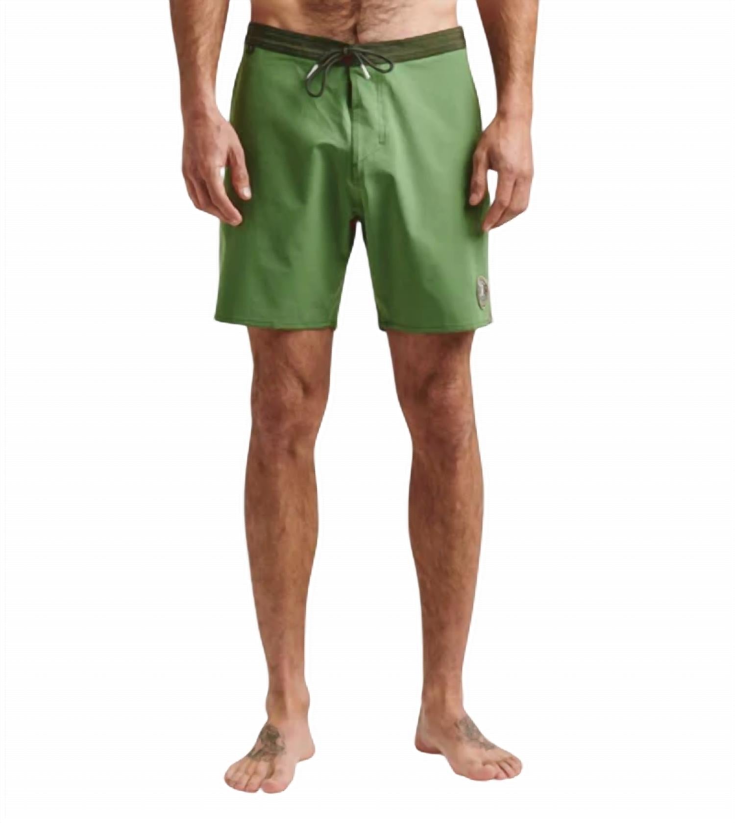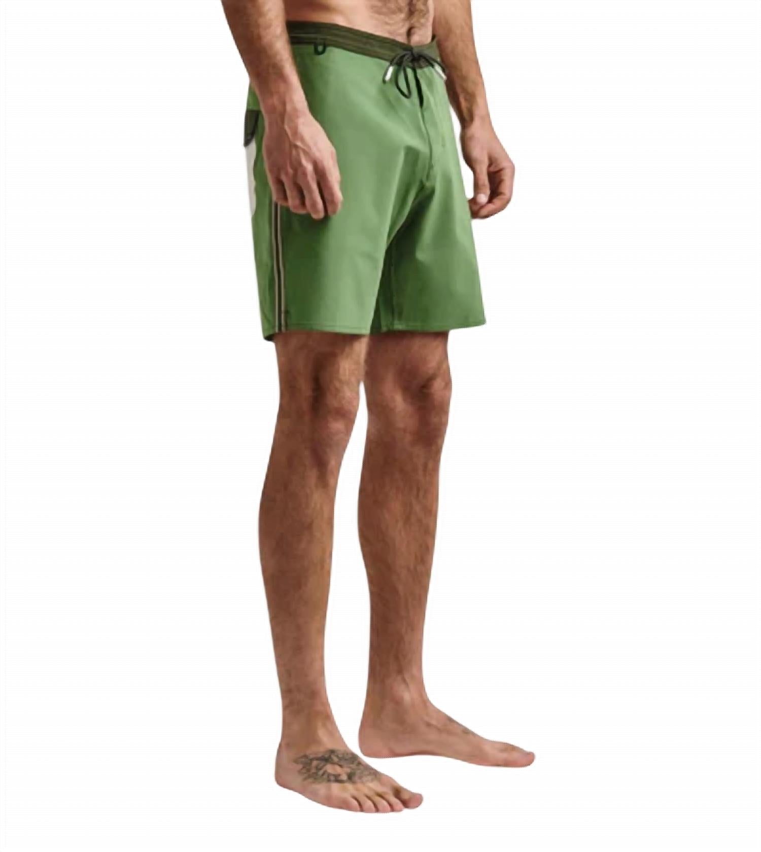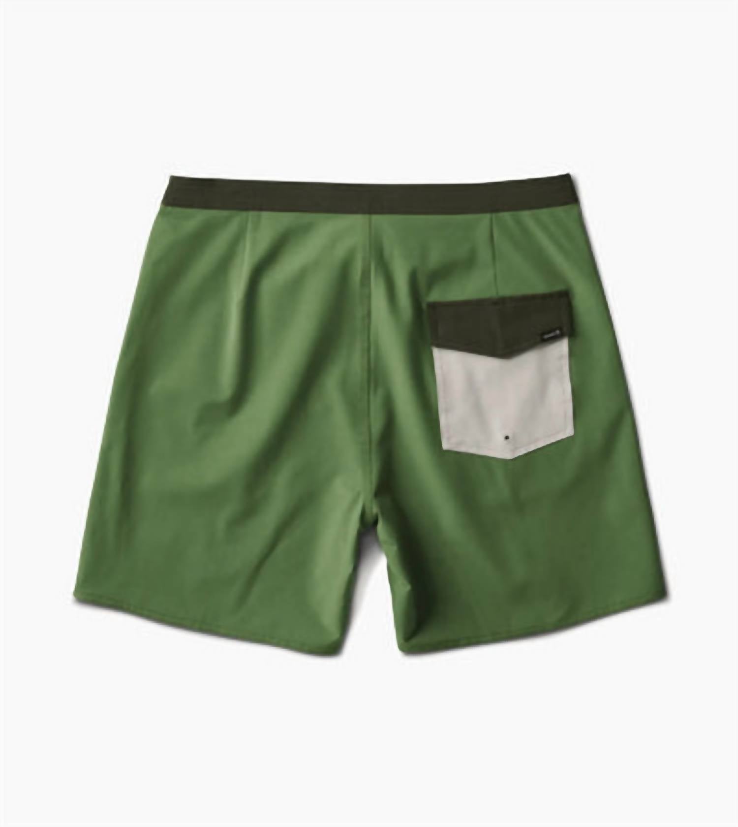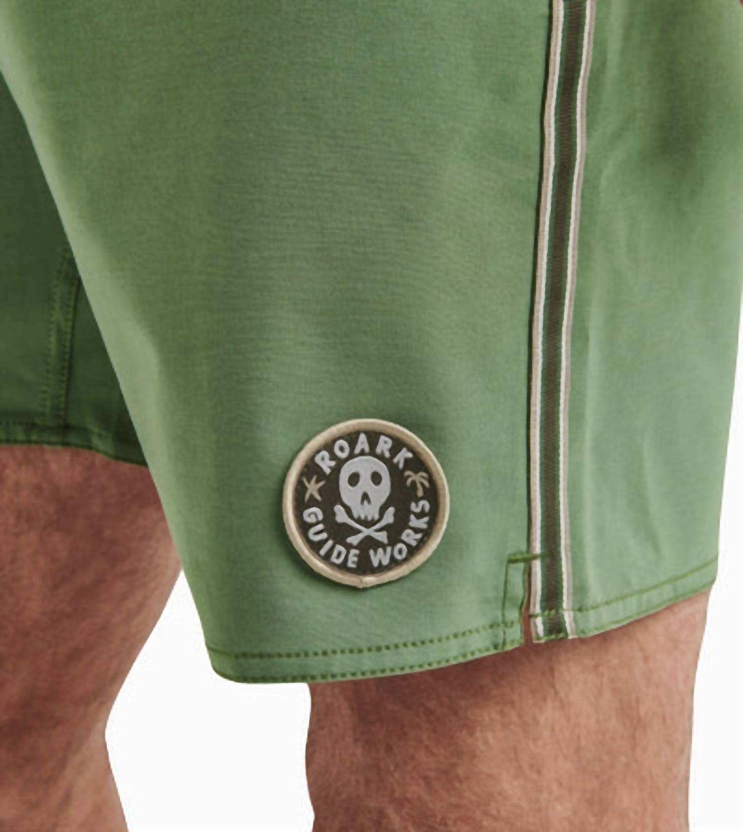 These boardshorts feature two side-seam hand pockets and one back patch Velcro flap pocket. They are designed with a drawstring waist and a Guide Works Skull embroidered patch. The dimensions for size 32 are a 17" outseam and a 7" inseam. Made from a blend of 48% recycled polyester, 36% polyester, 9% hemp, and 7% elastane.